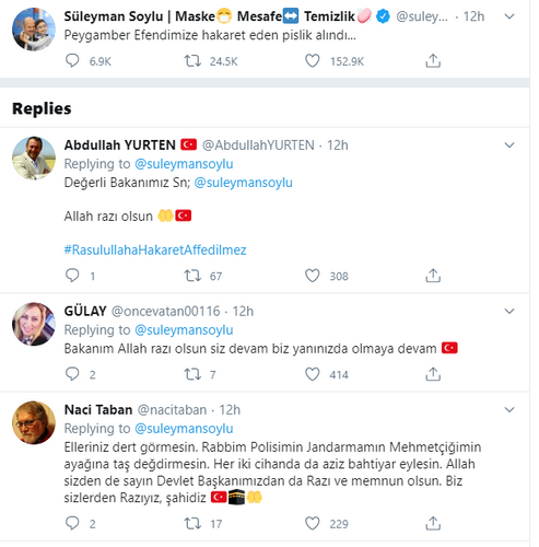 Lent.az yerli KİV-ə istinadla bildirir ki, Daxili İşlər naziri Süleyman Soylu paylaşımında “Peyğəmbər əfəndimizə nalayiq ifadələr işlədən pislik saxlanıldı” deyə, qeyd edib.