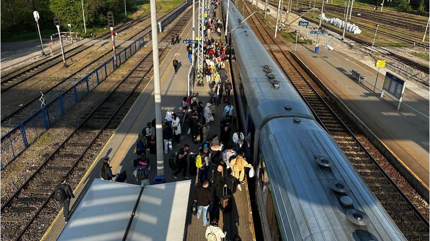 Başlıq: Ukraynalı qaçqınların marşrutu Polşanın cənub-şərqində, Ukrayna ilə sərhəddən təqribən 25 km aralıda yerləşən Çelm şəhərindəki dəmir yolu stansiyası. Foto: Nino Çiçua - Netgazeti