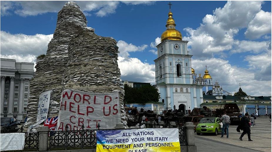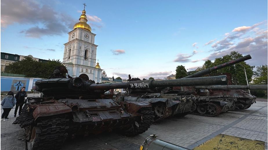 Şəkilaltı mətn: Məhv edilmiş Rusiya tankları və zirehli nəqliyyat vasitələrinin Kiyevin Mihaylovskaya meydanında sərgilənir. Foto: Nino Çiçua - Netgazeti
