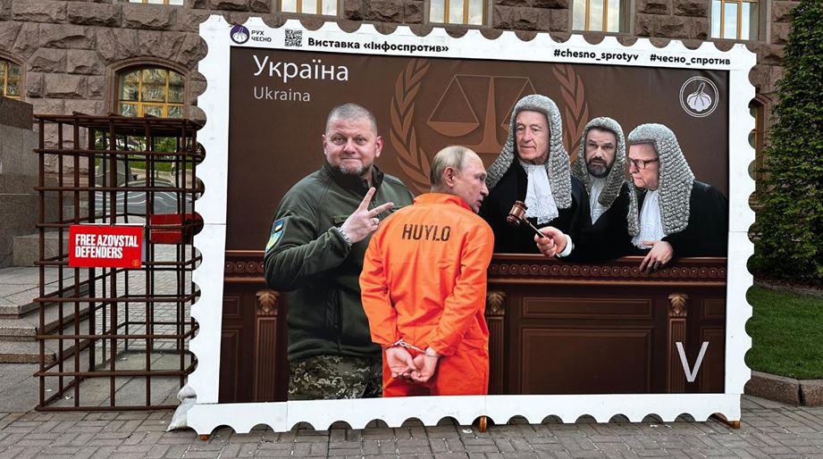 Başlıq: Kiyevin əsas küçələrindən olan Xreşçatikdəki poster. Posterdə Ukrayna generalı Valeriy Zalujniy tərəfindən Vladimir Putin məhbus geyimində Haqa Məhkəməsinə təqdim edilir. Foto: Nino Çiçua - Netgazeti