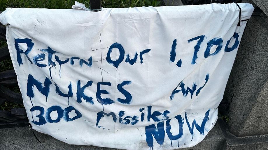 Şəkilaltı mətn: “1700 nüvə silahımızı indi geri qaytarın” - bu, Ukraynanın 1994-cü ildə dünyanın üçüncü ən böyük nüvə arsenalını Budapeşt Memorandumunun təhlükəsizlik zəmanətinə dəyişməsinə cavab olaraq səslənən tələbdir.