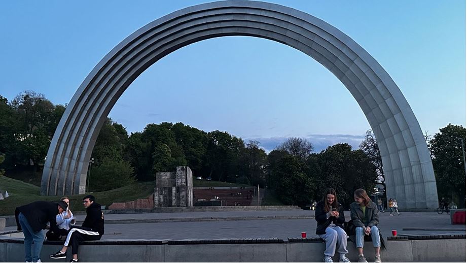 Şəkilaltı mətn: Ukrayna Xalqının Azadlıq Tağı (keçmiş Xalqlar Dostluğu Tağı). 2022-ci ilin aprel ayında hökumət rus və ukrayna xalqları arasında dostluğu təcəssüm etdirən iki fəhlənin heykəlini sökdü. Foto: Nino Çiçua - Netgazeti