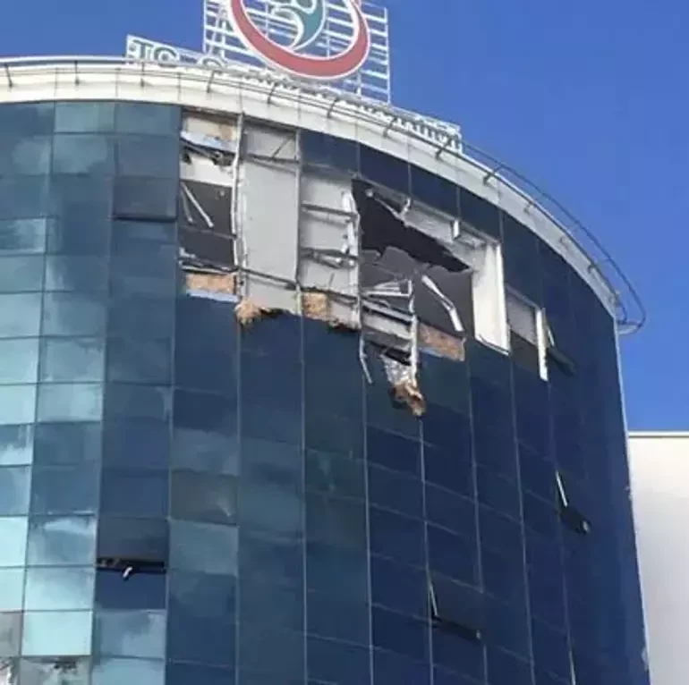 Helikopterin xəstəxanaya çırpılması nəticəsində binanın fasadındakı şüşələrin sındığı görünüb.