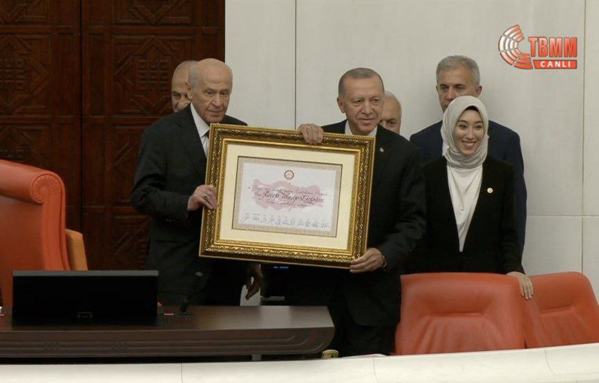Ərdoğanı müvəqqəti Məclis Sədri MHP sədri Devlet Bahçeli qarşılayıb.