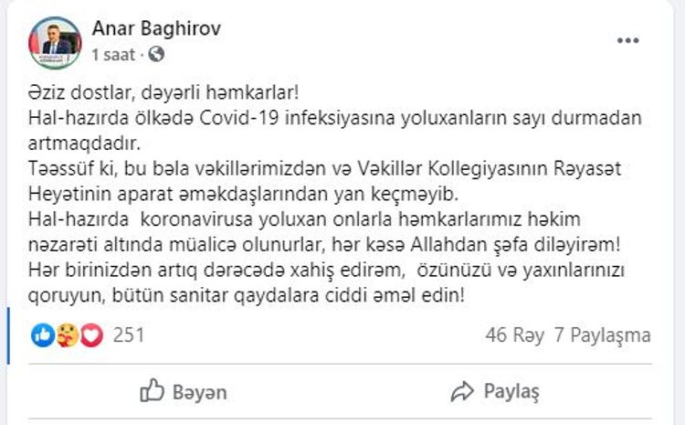 Lent.az-ın məlumatına görə, bu barədə Vəkillər Kollegiyasının sədri Anar Bağırov öz "Facebook" profilində paylaşım edib. Sədr təəssüflə qeyd edib ki, COVID-19 vəkillərdən və Vəkillər Kollegiyasının Rəyasət Heyətinin aparat əməkdaşlarından yan keçməyib: