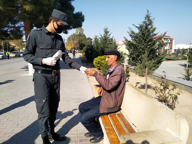 Bundan əlavə, insanların sıx toplaşdığı bank, poçt məntəqələrinin və digər idarələrin qarşısında xidmət aparan polis əməkdaşları sosial məsafəni gözlənilməsinə nəzarət etməklə yanaşı sakinlərə tibbi maska paylayırlar.