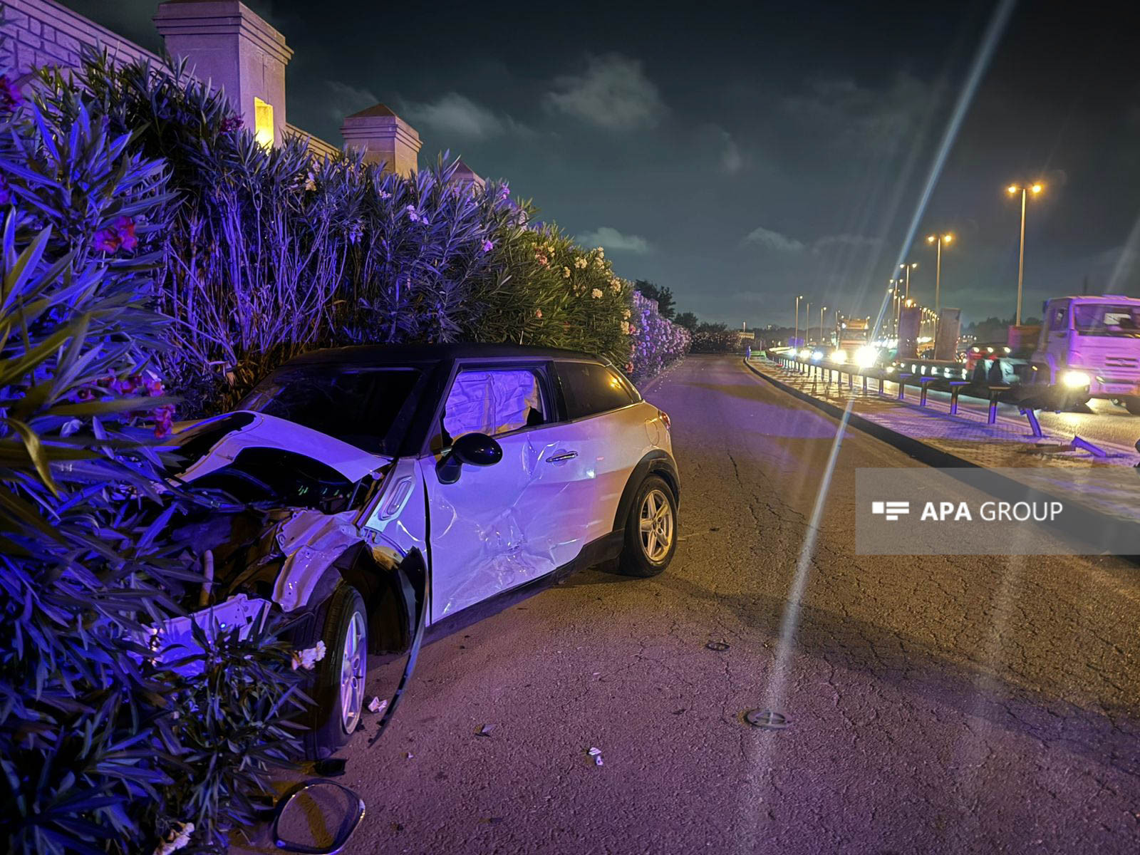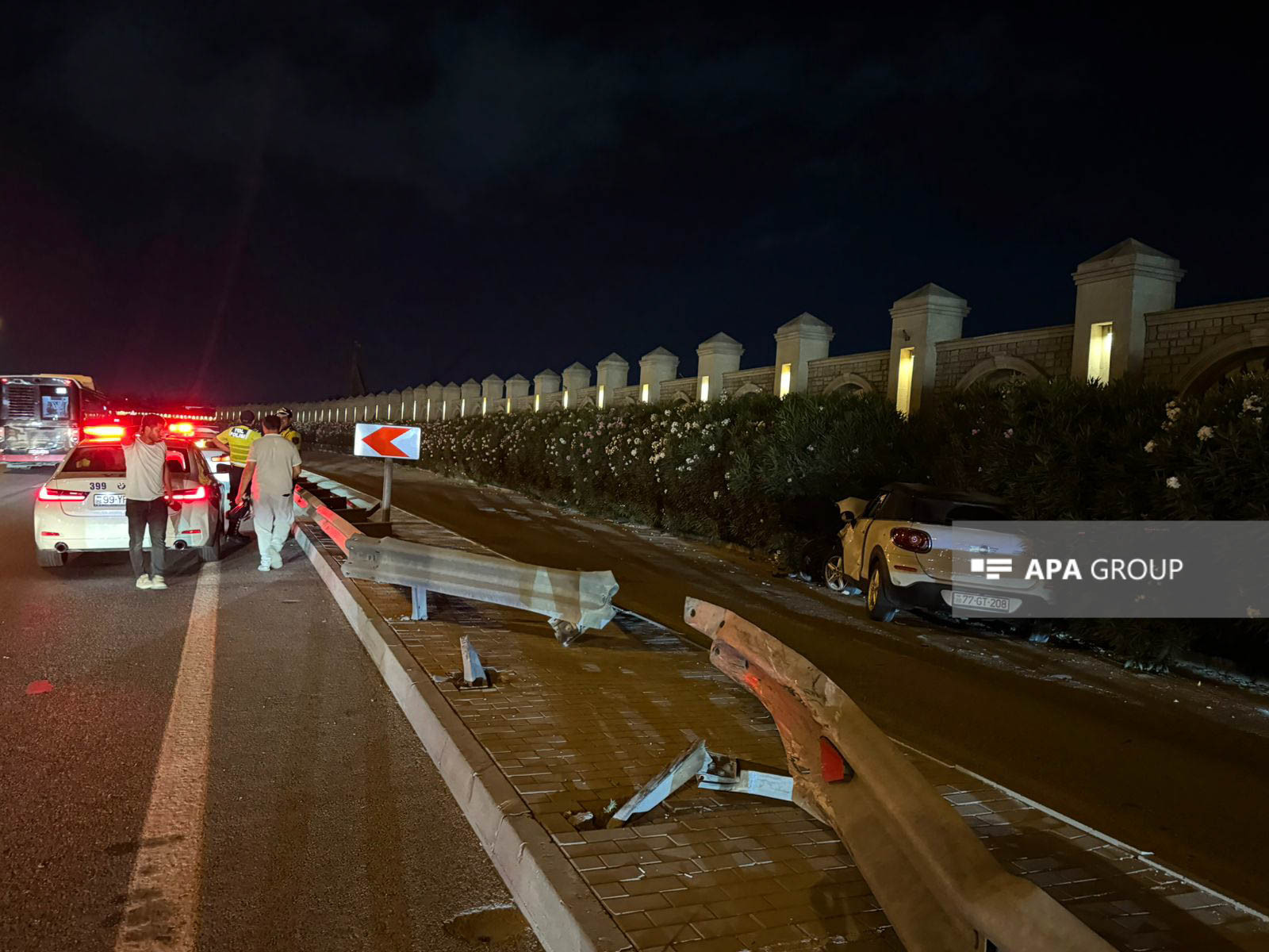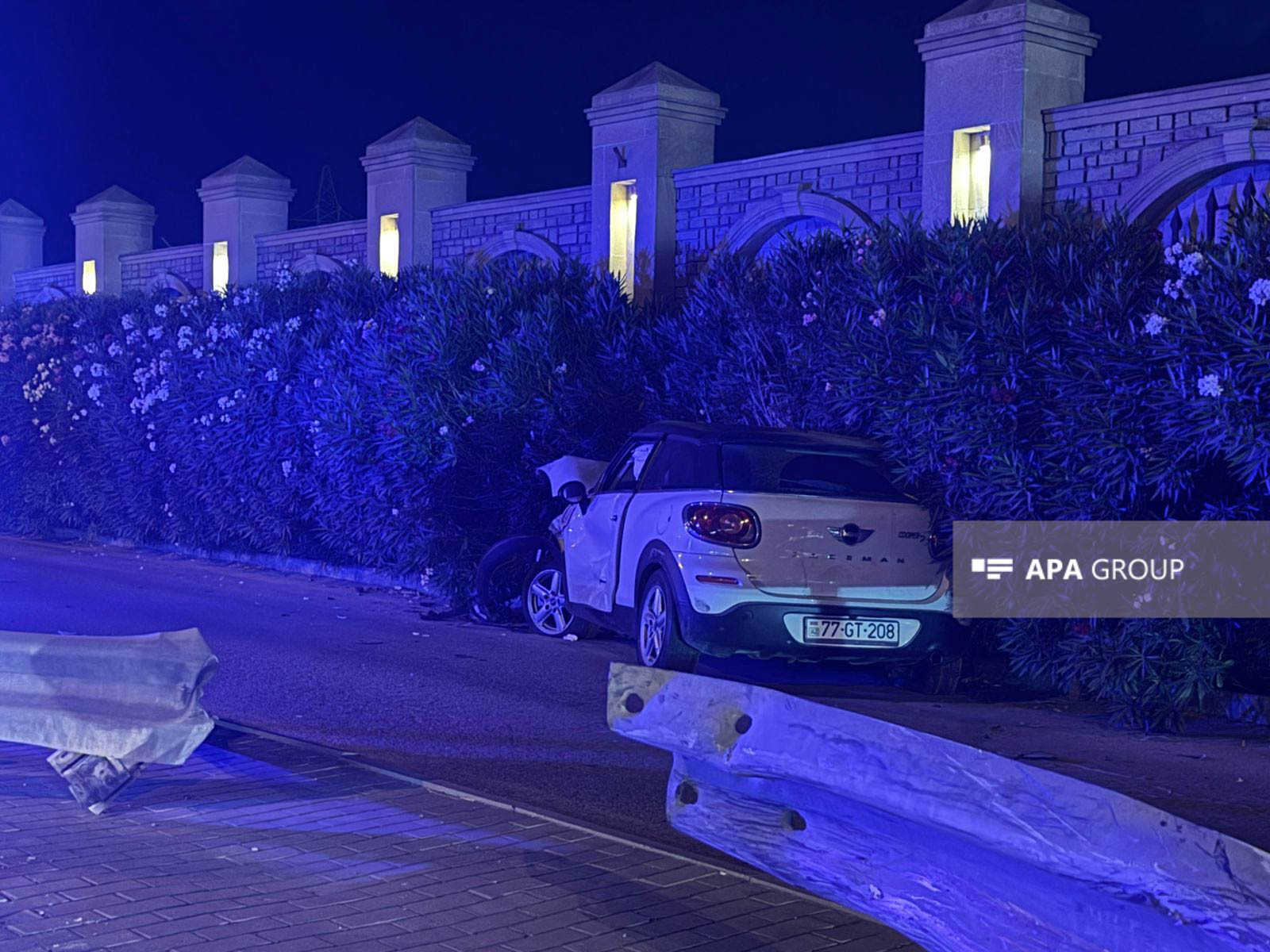 Zərbənin təsirindən "Mini Cooper" yolun kənarındakı dəmir maneəni aşaraq divara çırpılıb. Hadisə yerinə dərhal yol patrul xidməti əməkdaşları cəlb olunub.