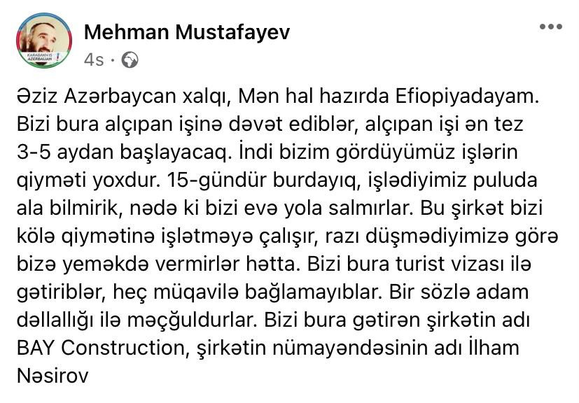 "Mən hal-hazırda Efiopiyadayam...15 gündür burdayıq, işlədiyimiz pulu da ala bilmirik, nə də bizi evə yola salmırlar. Bu şirkət bizi kölə qiymətinə işlətməyə çalışır, razı düşmədiyimizə görə, bizə yemək də vermirlər hətta... Bir sözlə adam dəllallığı ilə məşğuldurlar...".