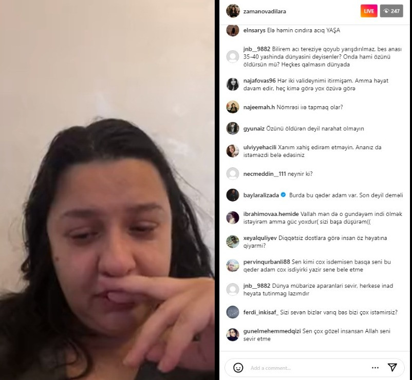 Lent.az xəbər verir ki, o, “Instagram”da canlı yayım açaraq, özünü öldürəcəyini bildirib. İzləyicilər müxtəlif şərhlər yazaraq onu bu addımdan çəkindirməyə çalışırlar.