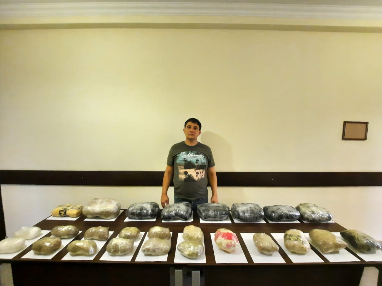 Saxlanılan şəxsin Bakı şəhər sakini 35 yaşlı Piriyev Məhərrəm Vahab oğlu olması müəyyənləşdirilib. Əlindəki bağlamaya baxış zamanı içərisində ümumi çəkisi 34 kiloqram 800 qram narkotik vasitə (26400 qram heroin, 2000 qram “metamfetamin” və 6400 qram marixuana) aşkar olunaraq götürülüb.