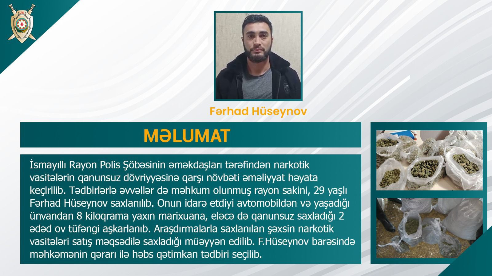 DİN-in mətbuat xidmətinin Şəki regional qrupundan Lent.az-a verilən məlumata görə, tədbirlərlə əvvəllər də məhkum olunmuş rayon sakini, 29 yaşlı Fərhad Hüseynov saxlanılıb. Onun idarə etdiyi avtomobildən və yaşadığı ünvandan 8 kiloqrama yaxın marixuana, eləcə də qanunsuz saxladığı 2 ədəd ov tüfəngi aşkarlanıb. Araşdırmalarla saxlanılan şəxsin narkotik vasitələri satış məqsədilə saxladığı müəyyən edilib.