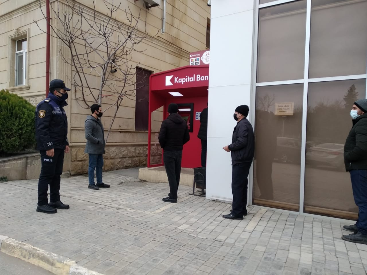 Bundan əlavə, insanların sıx toplaşdığı bank, poçt məntəqələrinin və digər idarələrin qarşısında polis əməkdaşları xidmət apararaq, sosial məsafənin gözlənilməsinə nəzarət edir, tibbi maskadan istifadə etməyən sakinlərə maska paylayırlar.