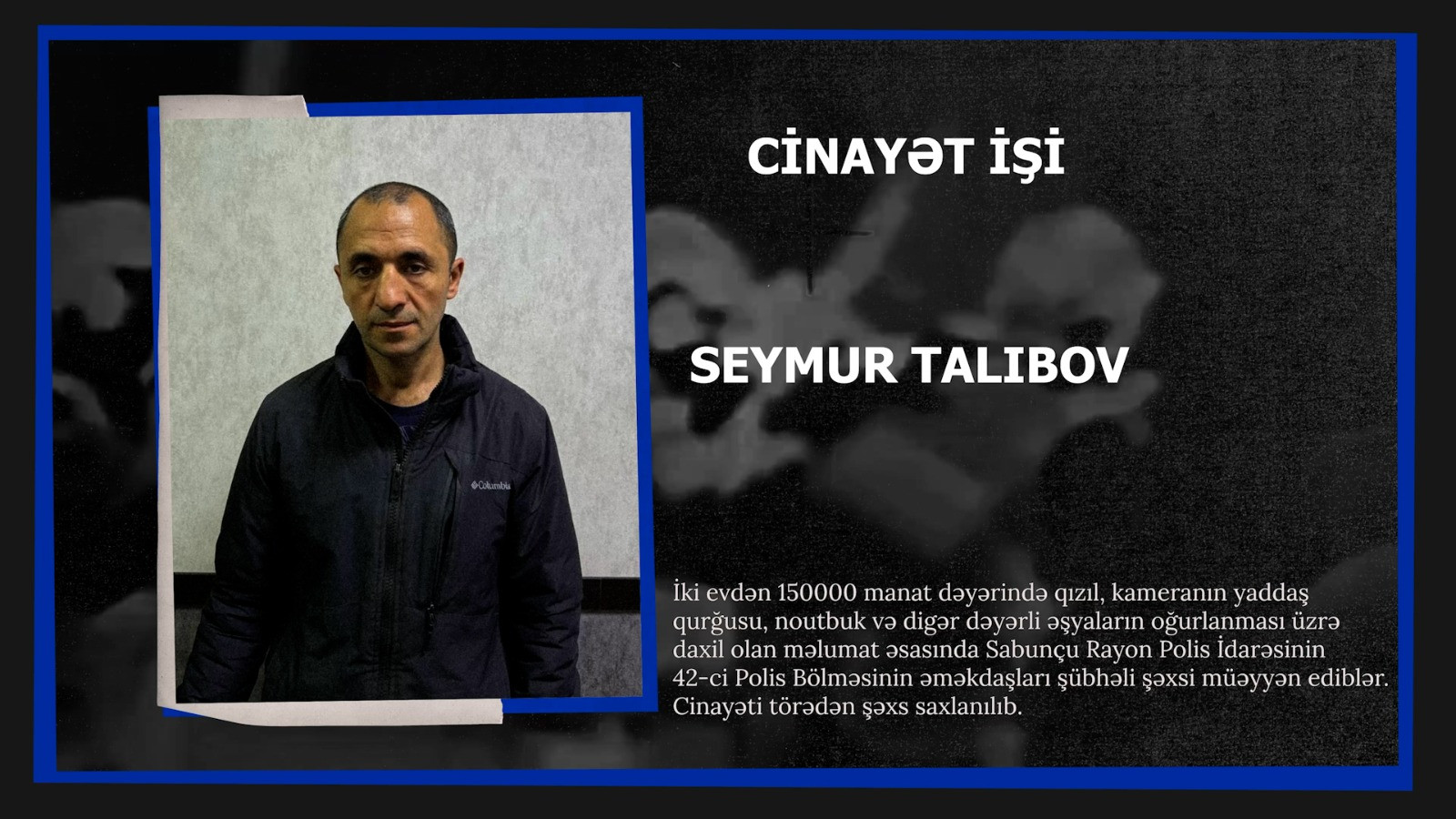 Daxili İşlər Nazirliyindən Lent.az-a verilən xəbərə görə, iki evdən 150 min manat dəyərində qızıl, kameranın yaddaş qurğusu, noutbuk və digər dəyərli əşyaların oğurlanması üzrə daxil olan məlumat əsasında Sabunçu rayon Polis İdarəsinin 42-ci Polis Bölməsinin əməkdaşları şübhəli şəxsi müəyyən ediblər. Cinayəti törədən şəxs - əvvəllər dəfələrlə məhkum olunmuş 45 yaşlı Seymur Talıbov saxlanılıb. O, ifadəsində qeyd edilən əməli törətdiyini və qızıl-zinət əşyalarını hissələrə ayıraraq satmağı planlaşdırdığını etiraf edib.