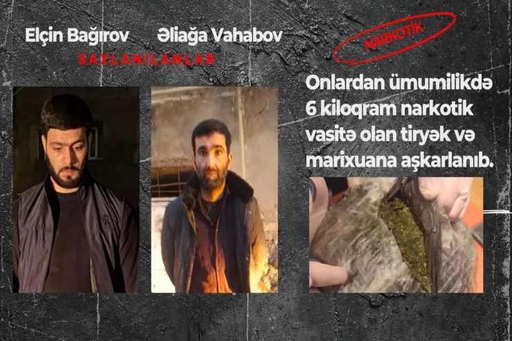 DİN mətbuat xidmətindən Lent.az-a verilən xəbərə görə, Nərimanov Rayon Polis İdarəsi 17-ci Polis Şöbəsinin əməkdaşları tərəfindən narkotik vasitələrin qanunsuz dövriyyəsinə qarşı keçirilən tədbir zamanı əvvəllər məhkum olunmuş 29 yaşlı Elçin Bağırov və 37 yaşlı Əliağa Vahabov saxlanılıblar. Həmin şəxslərdən ümumilikdə 6 kiloqram narkotik vasitə olan tiryək və marixuana aşkarlanıb.
