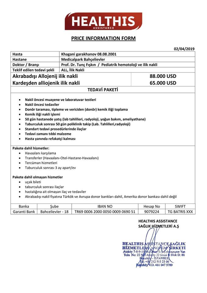 18 yaşlı Qaraxanov Xəqani Sədi oğluna T hüceyrəli limfoblast limfoma diaqnozu qoyulub.