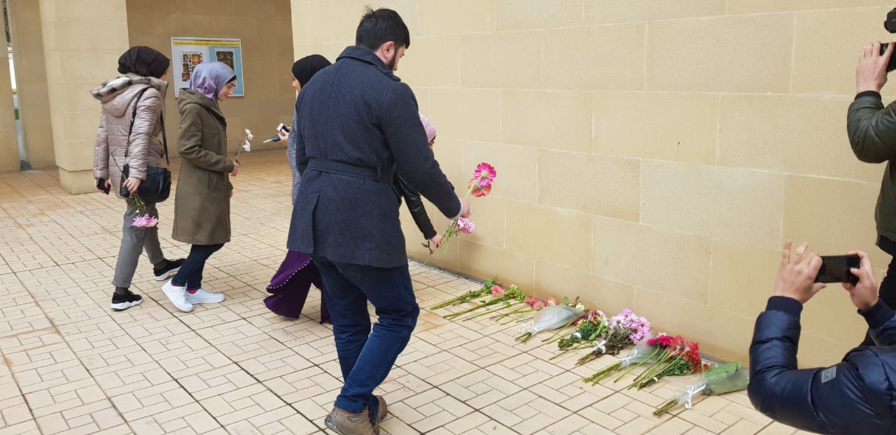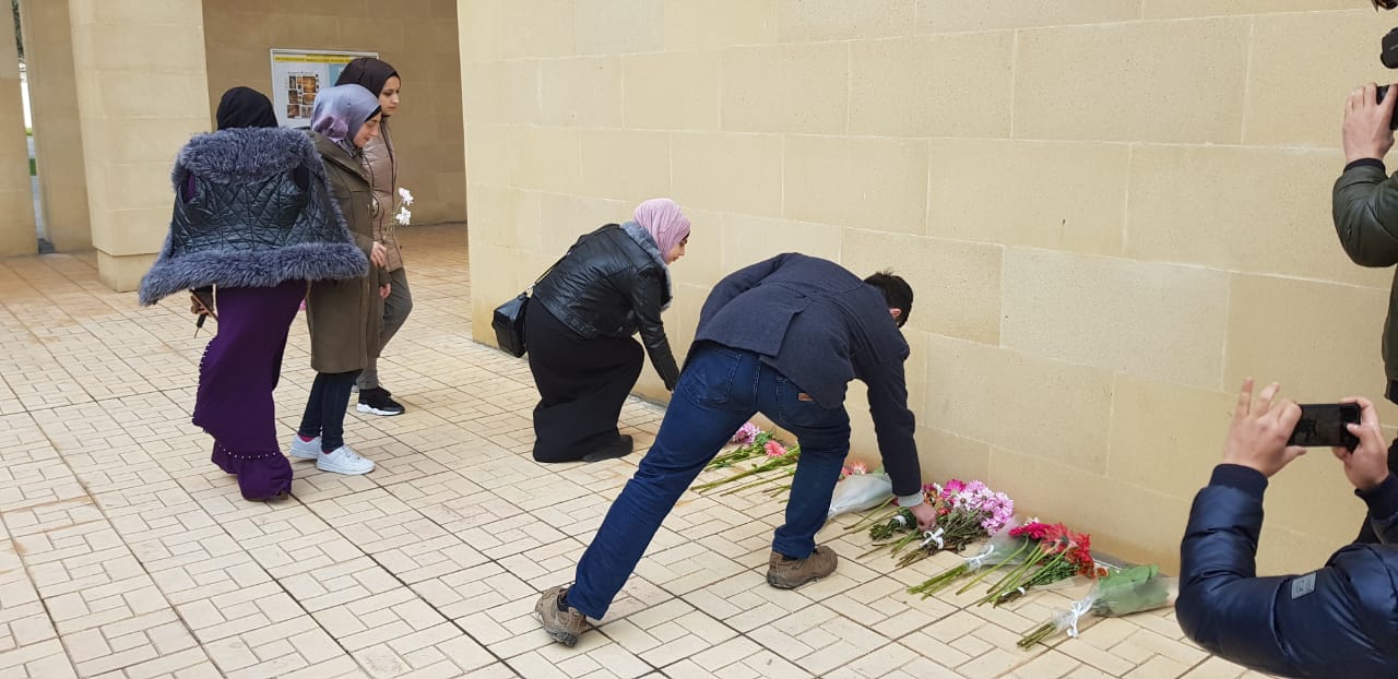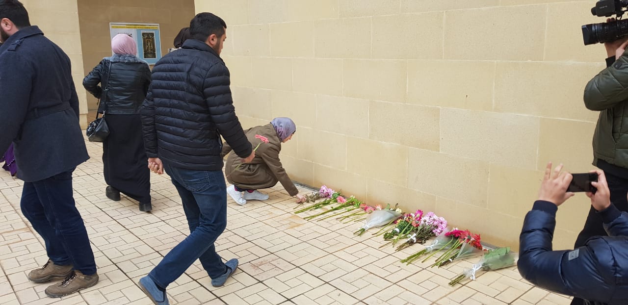 Müsəlman gənclər kilsə önündəki Həzrət Məryəm heykəlinə güllər qoyub, kədər sözlərini yazıblar.