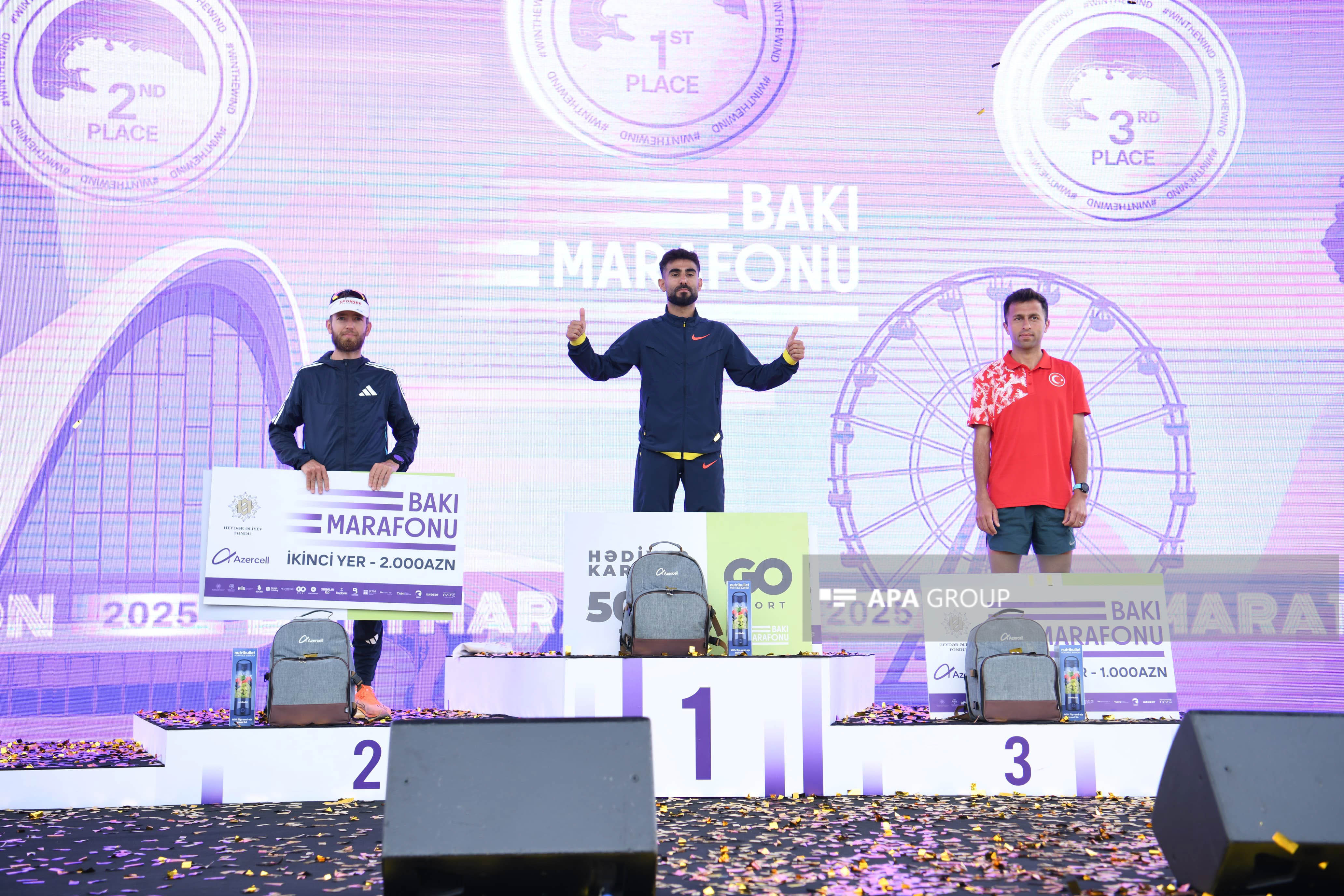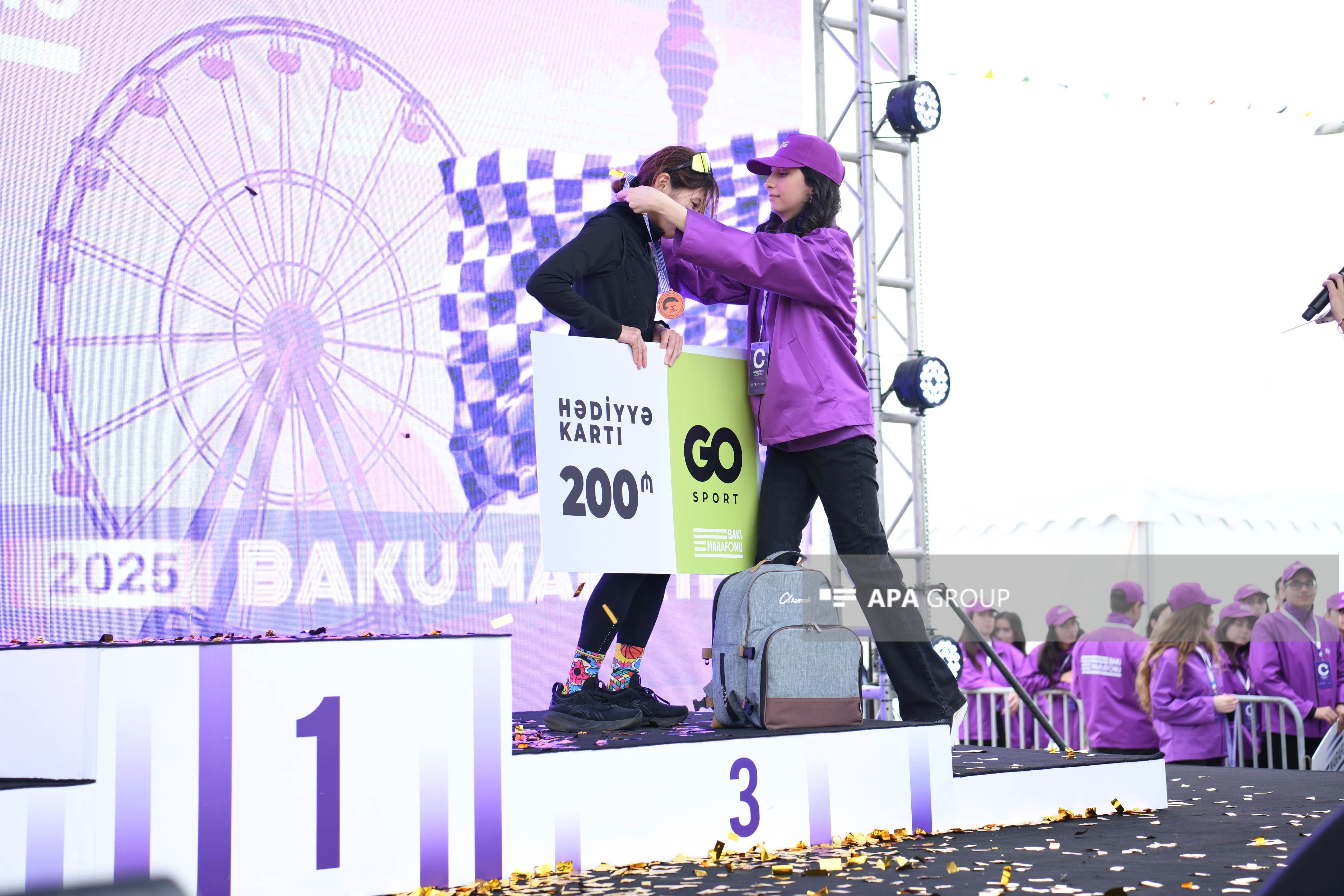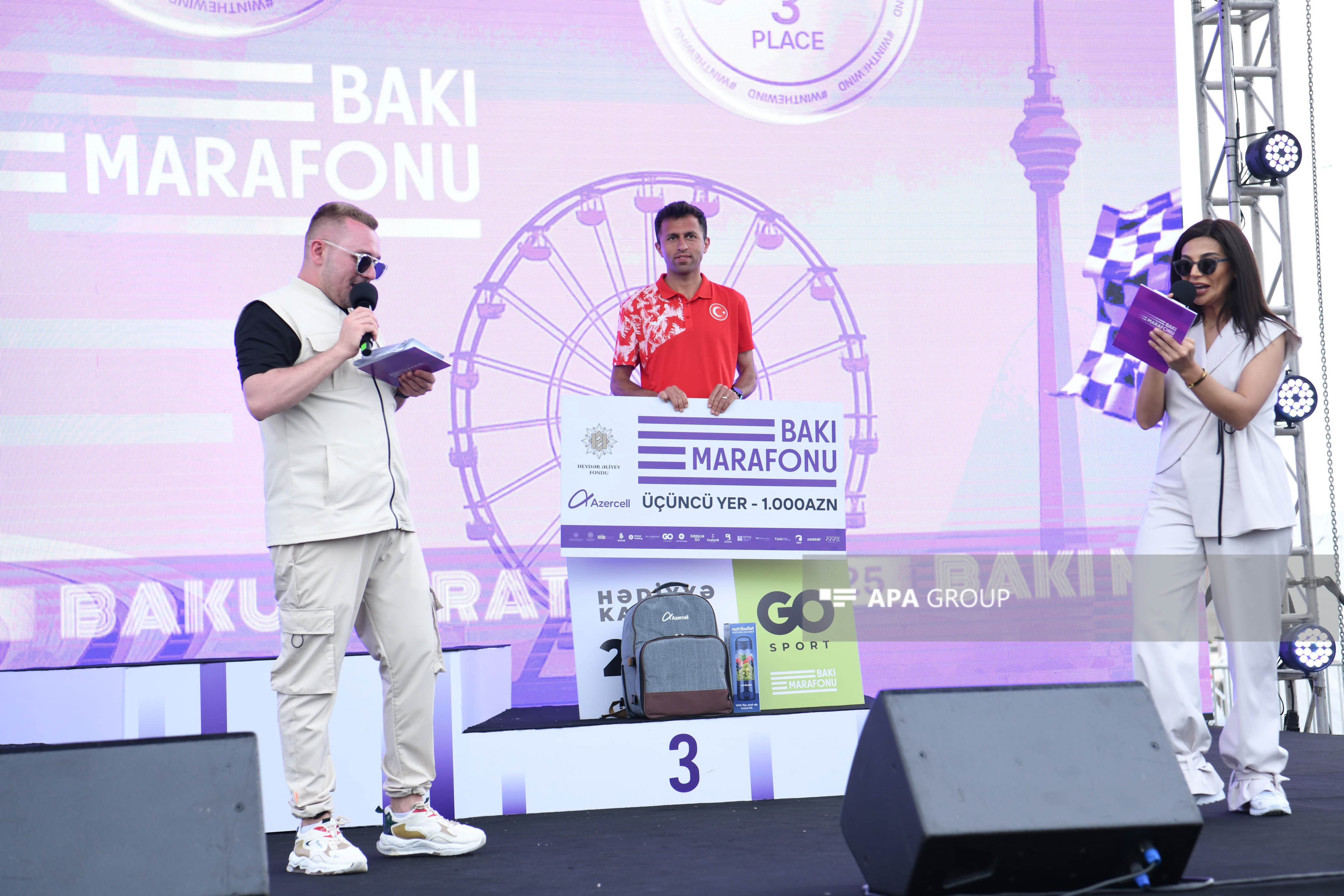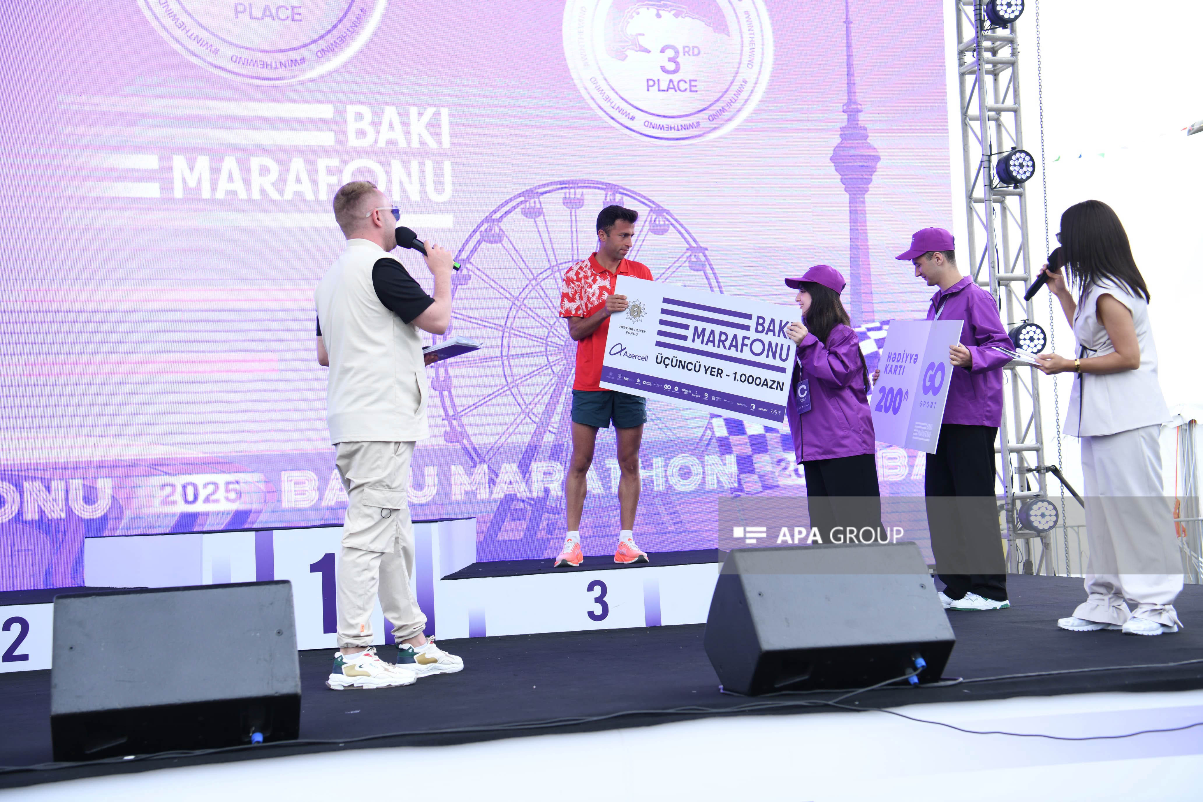 Marafonun kişi və qadın iştirakçıları qaçış zolağında ilk 3 yer uğrunda mübarizə aparıb. Kişi və qadın kateqoriyalarının hər birində 1-ci yerin qalibi 3 000 AZN, 2-ci yerin qalibi 2 000 AZN, 3-cü yerin qalibi isə 1 000 AZN məbləğində mükafat və hədiyyələrlə, eləcə də medal və sertifikatlarla təltif olunub. Finiş xəttini keçən ilk 2000 iştirakçı da “Bakı Marafonu 2025”in medalları ilə mükafatlandırılıb. Bununla yanaşı, bütün marafon iştirakçılarına və yarışın təşkilində dəstək göstərən könüllülərə sertifikatlar təqdim olunub.