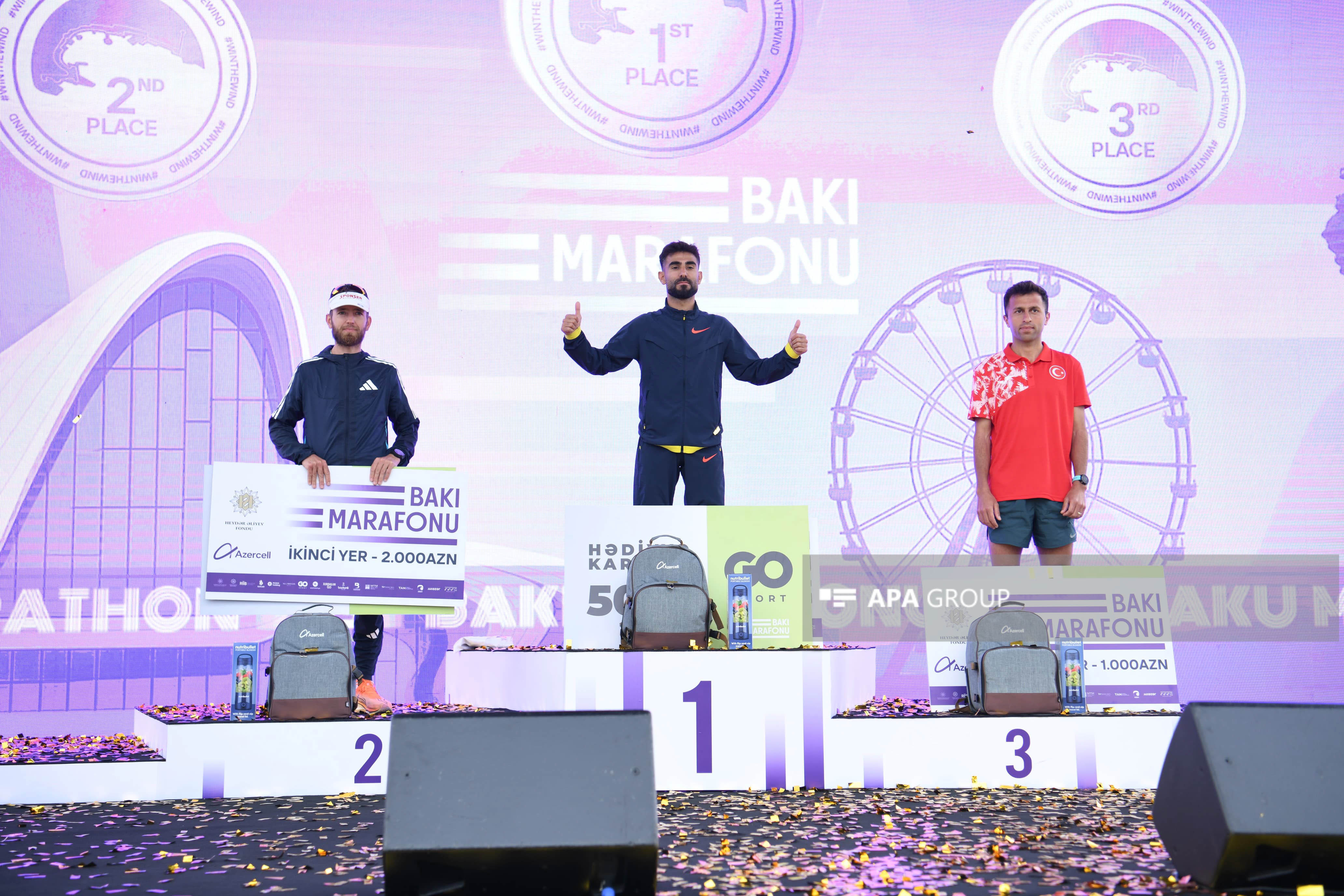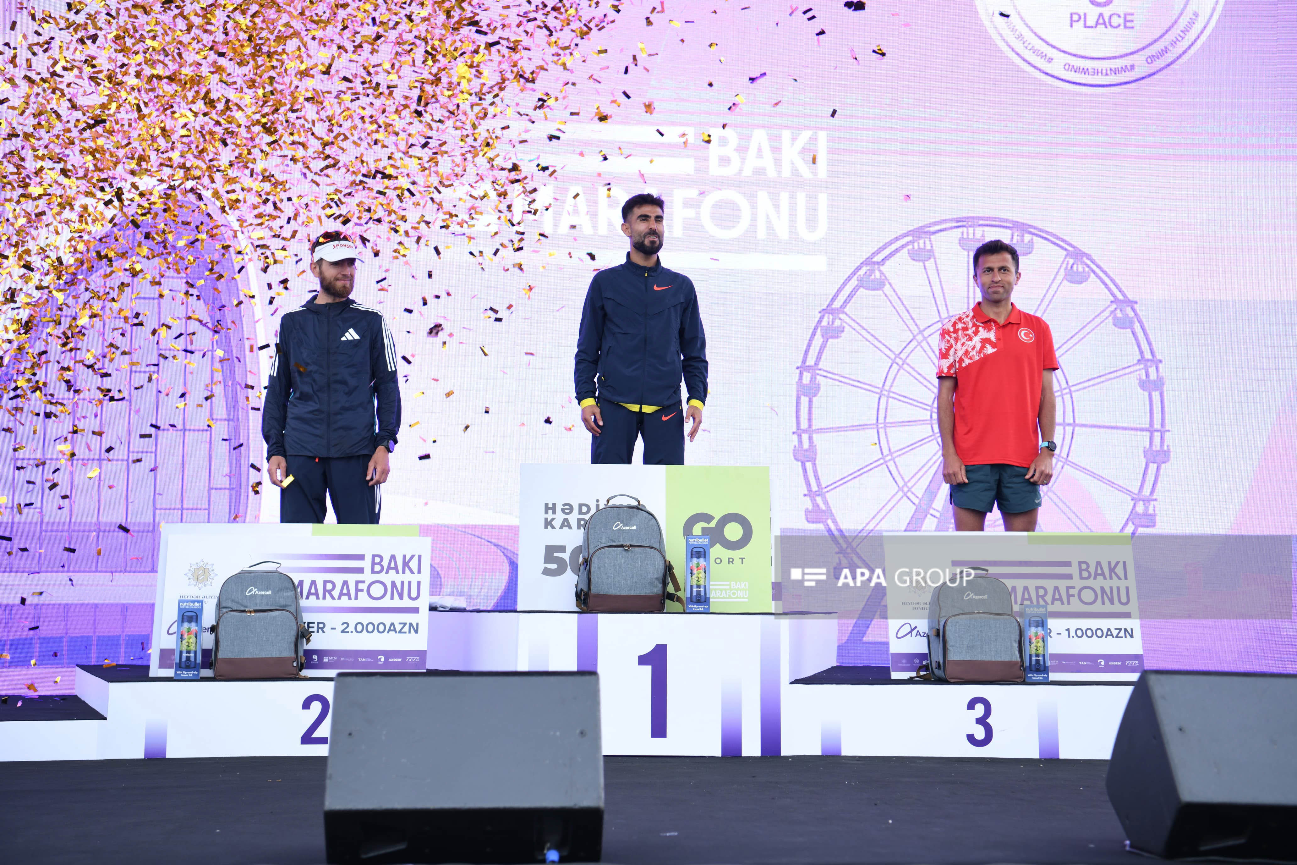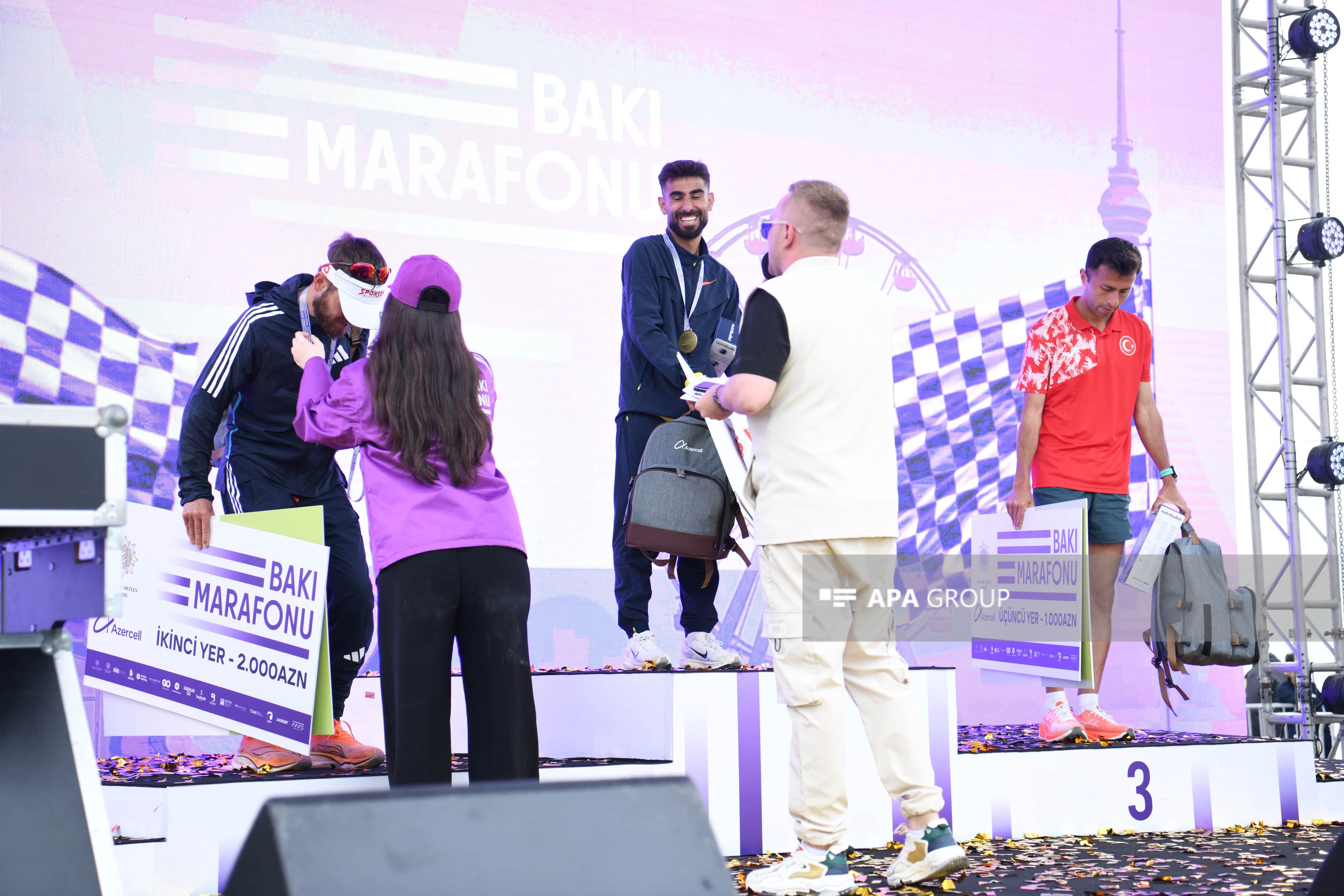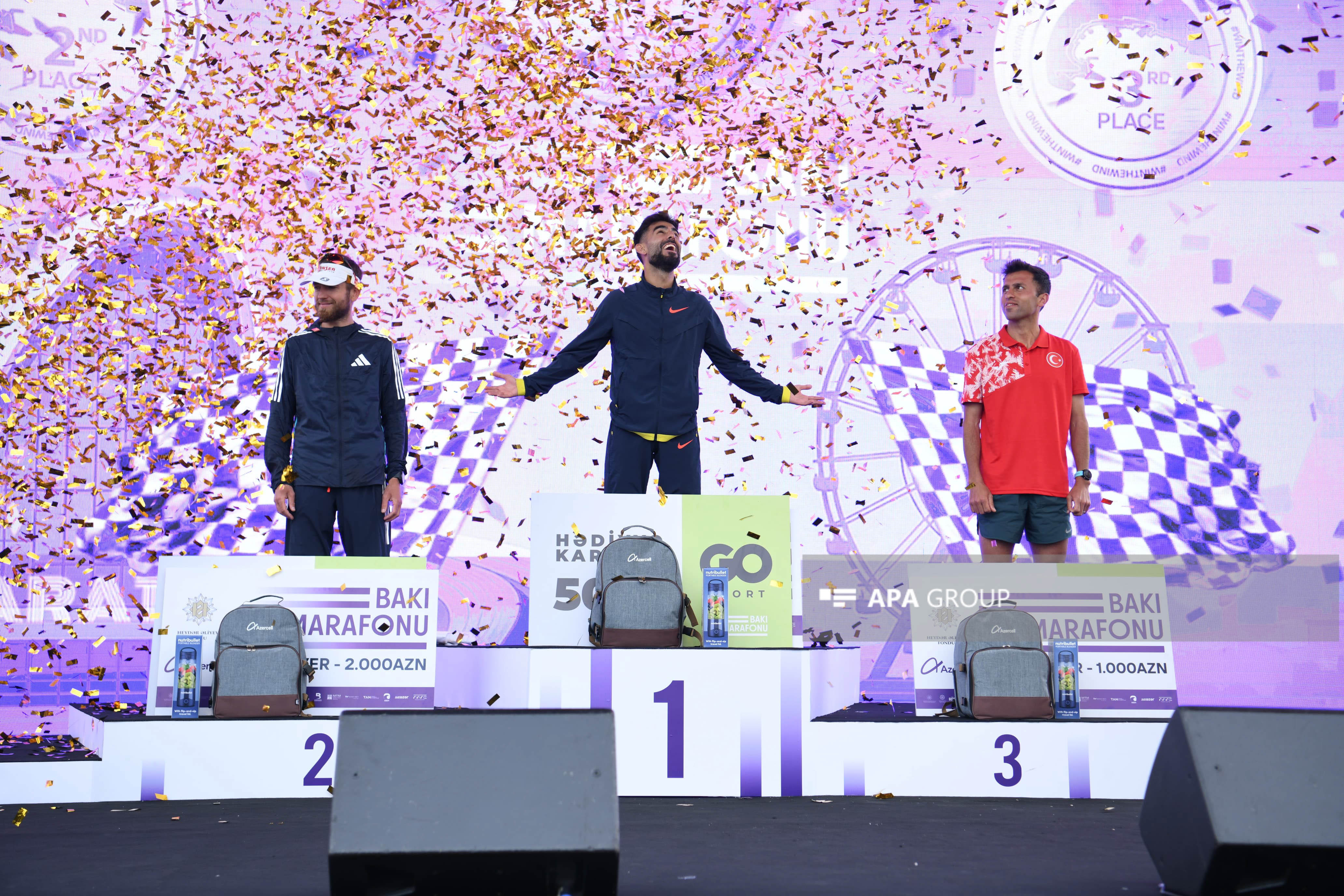 Marafonun kişi və qadın iştirakçıları qaçış zolağında ilk 3 yer uğrunda mübarizə aparıb. Kişi və qadın kateqoriyalarının hər birində 1-ci yerin qalibi 3 000 AZN, 2-ci yerin qalibi 2 000 AZN, 3-cü yerin qalibi isə 1 000 AZN məbləğində mükafat və hədiyyələrlə, eləcə də medal və sertifikatlarla təltif olunub. Finiş xəttini keçən ilk 2000 iştirakçı da “Bakı Marafonu 2025”in medalları ilə mükafatlandırılıb. Bununla yanaşı, bütün marafon iştirakçılarına və yarışın təşkilində dəstək göstərən könüllülərə sertifikatlar təqdim olunub.