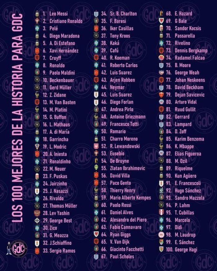 İlk 10-luğa həmçinin Pele (Braziliya), Dieqo Maradona (Argentina), Alfredo Di Stefano (İspaniya/Argentina), Xavi (İspaniya), Yohan Kroyff (Niderland), Ronaldo (Braziliya), Paolo Maldini (İtaliya), Frans Bekkenbauer (Almaniya) daxil edilib.