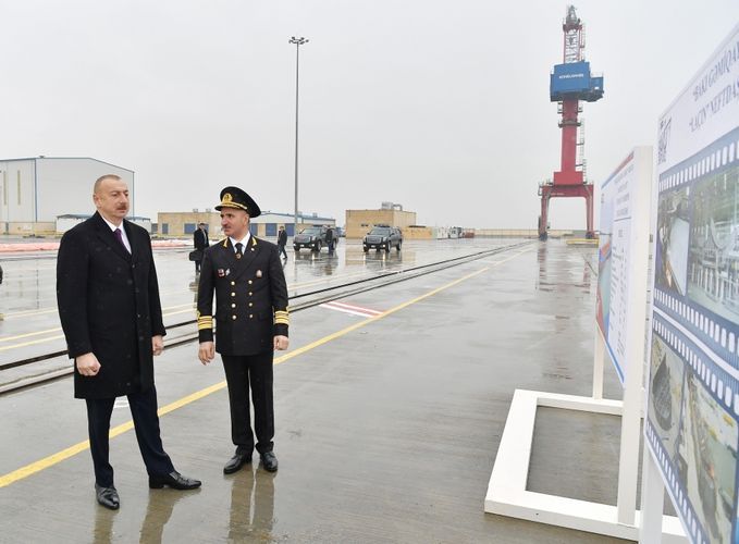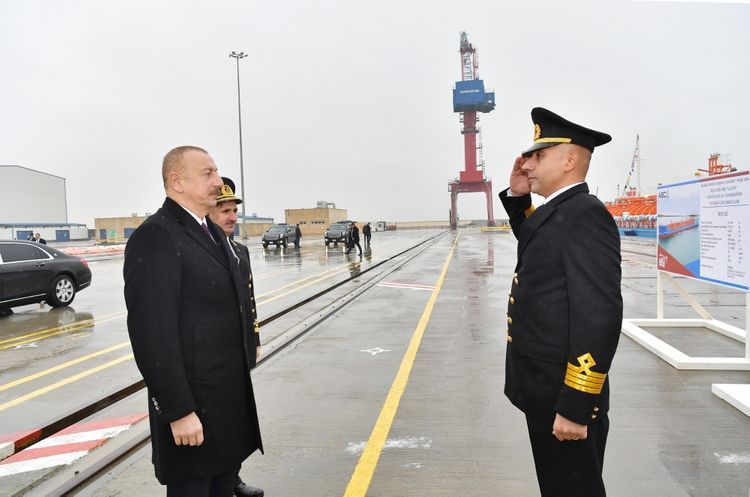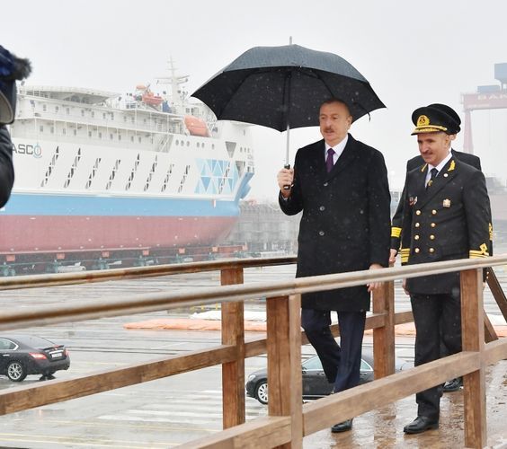 Sonra Prezident İlham Əliyev Bakı gəmiqayırma zavodunda inşa olunan ilk sərnişin, avtomobil və dəmiryolu vaqonları daşıyan “Ro-Pax” tipli “Azərbaycan” adlı gəmi-bərənin suya salınması mərasimində iştirak etdi.