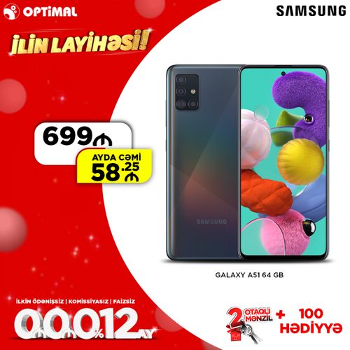 Samsung Galaxy A51 (4/64 GB, dördlü kamera) modelinə ayda 58.25 azn,