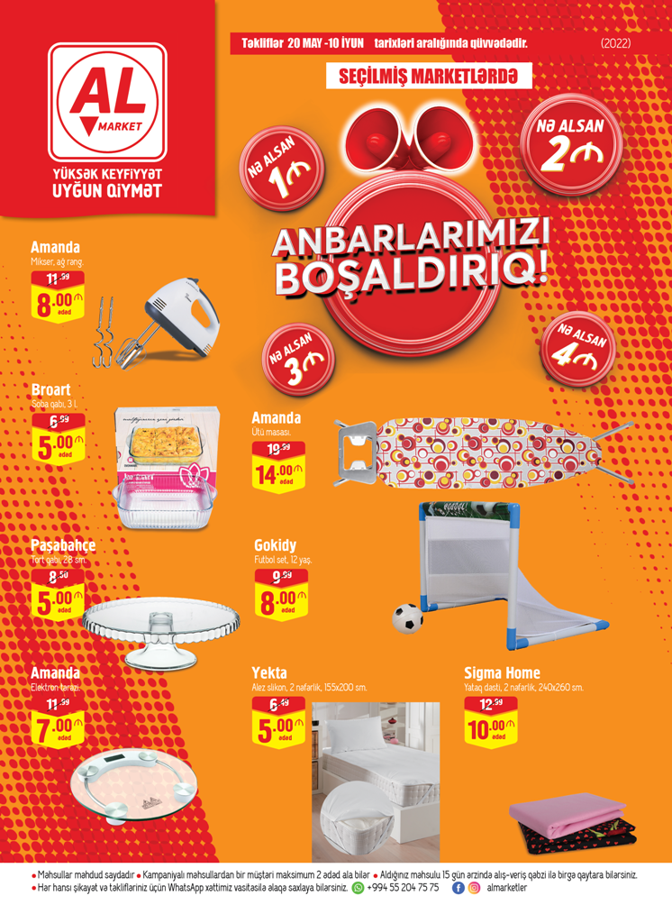 Ailənizin ehtiyacları üçün 20 May-10 İyun tarixlərində Al Marketlərə gəlin, siz də qazanın. Kampaniya günlərində süfrənizi bəzəyəcək dekorativ qablar,qonaqlarınızı zövqlə qarşılayacağınız boşqab, fincan və kasalar, su və çay stəkanlar, mətbəxinizdə rahatlıq yaradacaq elektrik əşyaları, saxlama qabları, plastik qablar, uşaqlar üçün oyuncaq və məktəb ləvazimatlarını 1,2,3,4 manatdan başlayan qiymətlərlə əldə edə bilərsiniz.