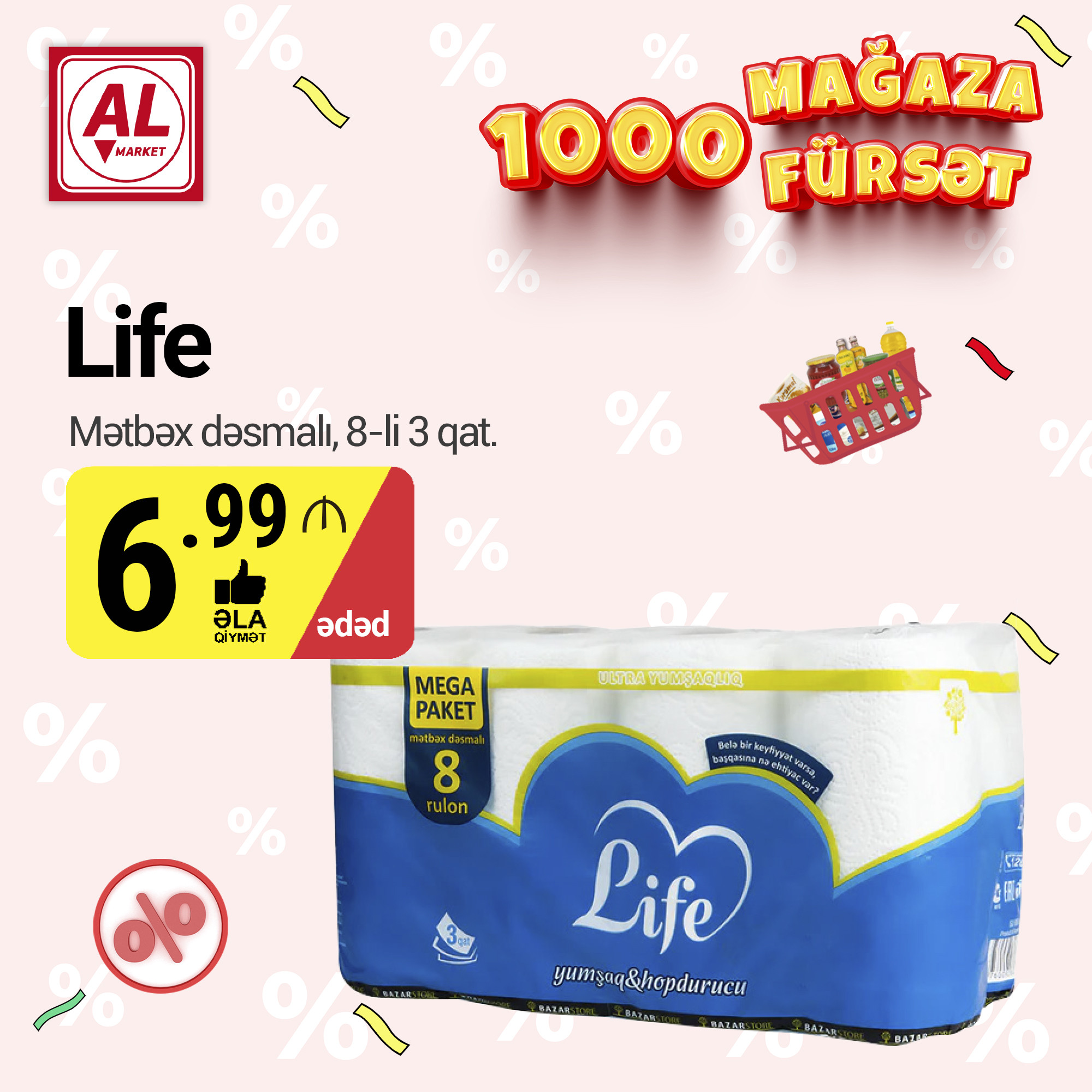 “Al Market” mağazaları ərzaq və qeyri-ərzaq məhsulları üzrə çeşidliliyini yerli və qlobal brendlər, həmçinin özünəməxsus məhsulları ilə zənginləşdirir. “Yüksək keyfiyyət, uyğun qiymət” sloqanını əsas tutan “Al Market” ailənizin ehtiyacları üçün lazım olan bütün məhsul çeşidliliyini daima sərfəli qiymətə təqdim edərək günlük xərclərinizi azaldmağa dəstək olur.