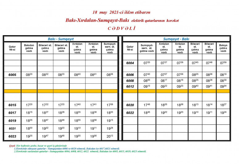 Bu isə Bakı-Pirşağı-Sumqayıt və Bakı-Xırdalan-Sumqayıt istiqamətində qatarların sayını artıracaq. Yeni cədvəlləri təqdim edirik.