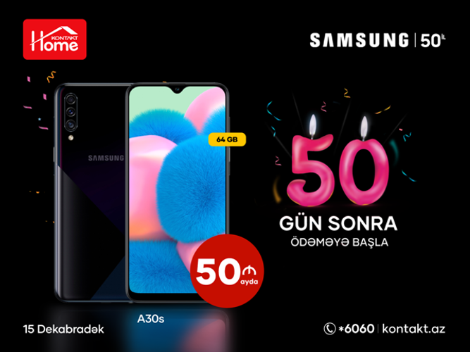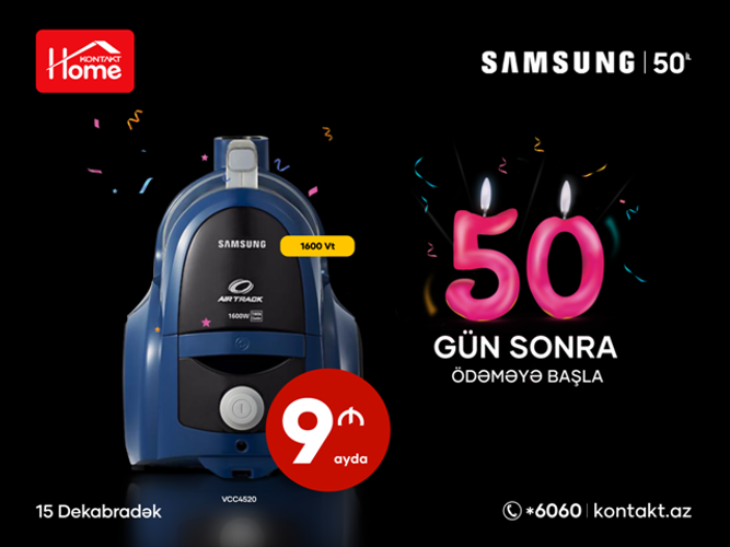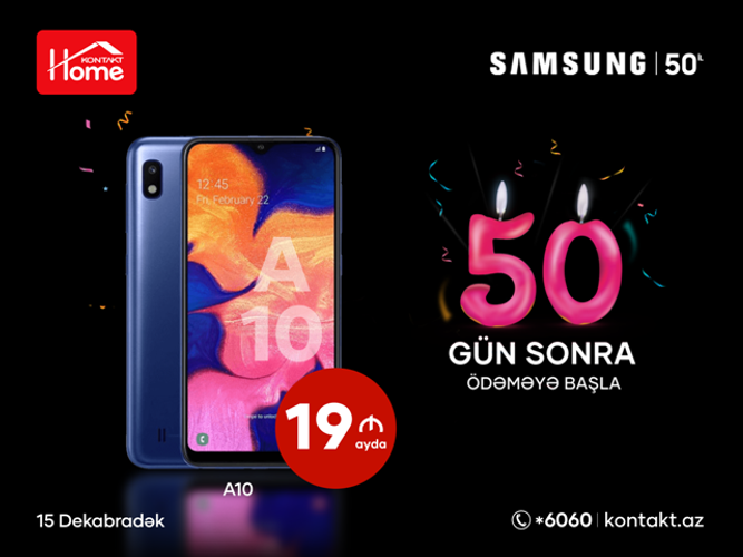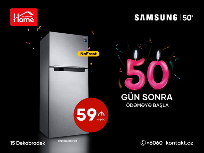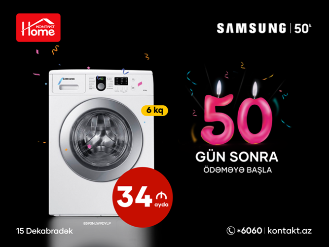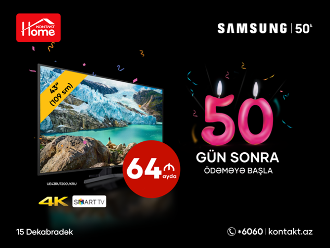 Samsung 50 illik Yubileyini Kontakt Home-da qeyd edir! Yubiley münasibətilə Samsung-un Azərbaycandakı rəsmi distribütoru Kontakt Home eksklüziv kampaniyaya başlayıb! Belə ki, 15 dekabradək yalnız Kontakt Home mağazalarında Samsung məhsullarını 18 ayadək FAİZSİZ hissə-hissə ödəniş şərtləriylə ala bilərsiniz. Həm də ödəməyə alış günü deyil, tam 50 gün sonra başlamaqla!