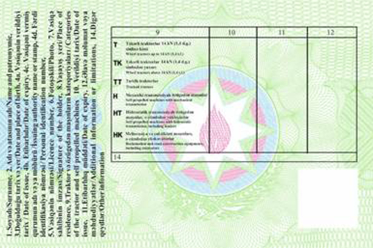 Vəsiqənin arxa tərəfinin sol tərəfində - 1. Soyadı/Surname, 2. Adı və atasının adı/Name and patronymic, 3. Doğulduğu tarix və yer/Date and place of birth, 4a. Vəsiqənin verildiyi tarix/Date of issue, 4b. Etibarlıdır /Date of expiry, 4c. Vəsiqəni vermiş qurumun adı və ya möhürü/İssuing authority name or stamp, 4d. Fərdi identifikasiya nömrəsi/Personal identification number, 5. Vəsiqənin nömrəsi/Licence number, 6. Fotoşəkil/Photo, 7. Vəsiqə sahibinin imzası/Signature of the holder, 8. Yaşayış yeri/Place of residence, 9.Traktor və özügedən maşınların kateqoriyaları/Categories of the tractor and self-propelled machines, 10. Verildiyi tarix/Date of issue, 11. Etibarlılıq müddəti/Date of expiry, 12. Əlavə məlumat və ya məhdudiyyətlər/Additional information or limitations, 14. Digər qeydlər/Other information - sözləri yazılır.