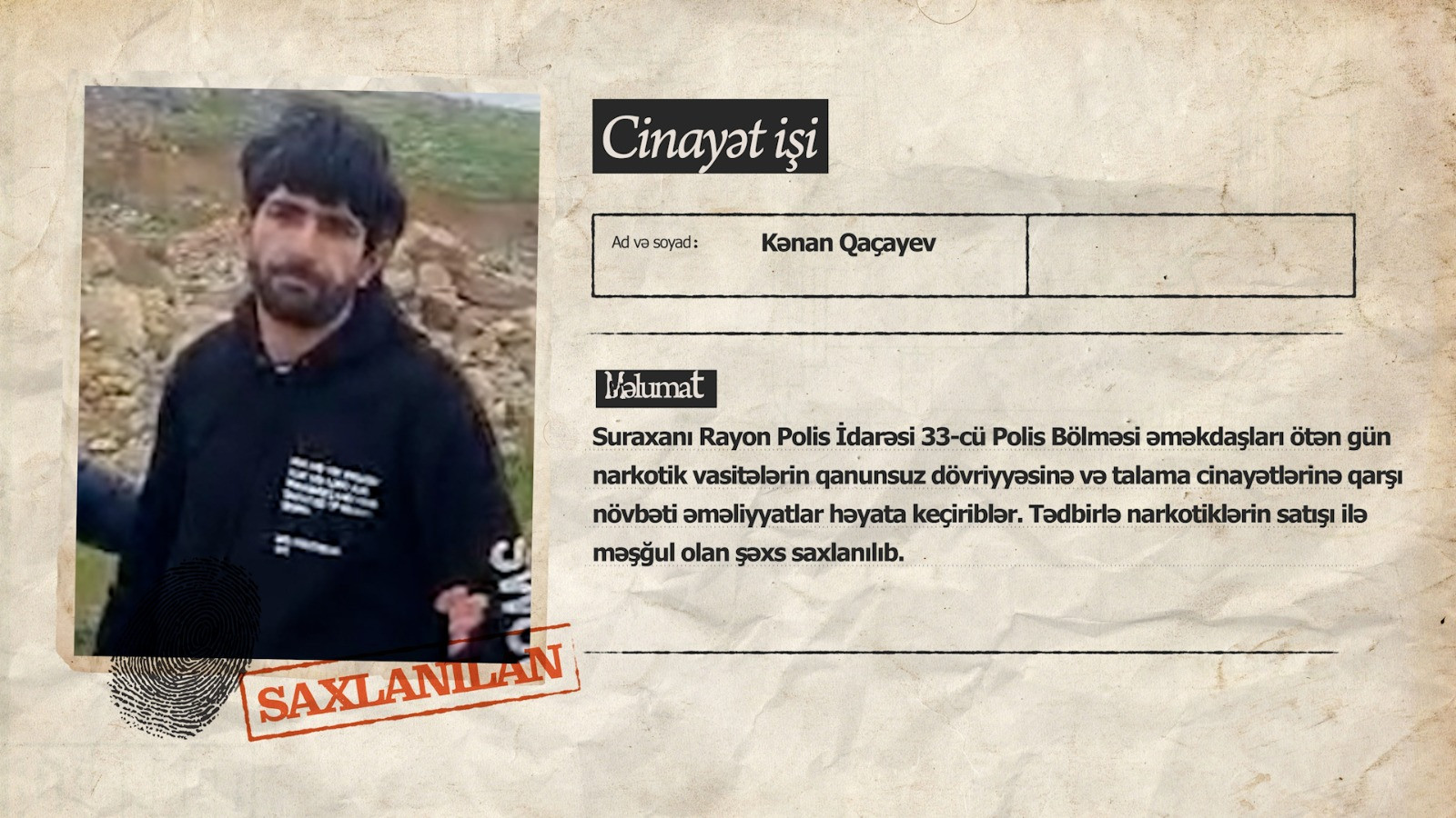 Daxili İşlər Nazirliyindən Lent.az-a verilən xəbərə görə, nəticədə narkotiklərin satışı ilə məşğul olan əvvəllər məhkum olunmuş 31 yaşlı Kənan Qaçayev saxlanılıb. Ondan 2 kiloqrama yaxın psixotrop maddə metamfetamin aşkarlanıb.