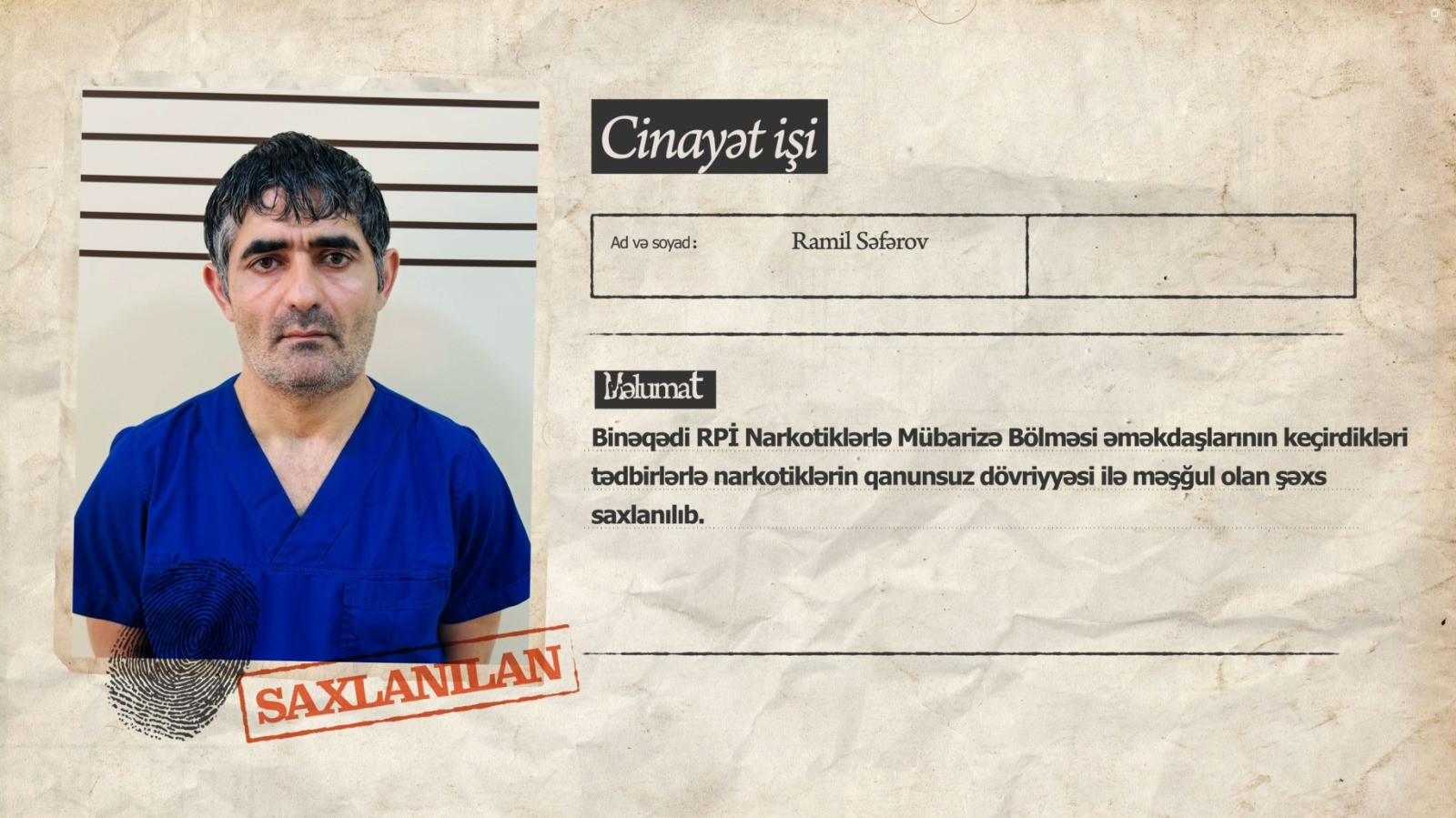 Daxili İşlər Nazirliyindən Lent.az-a verilən xəbərə görə, Binəqədi rayon Polis İdarəsinin Narkotiklərlə Mübarizə Bölməsi əməkdaşlarının keçirdikləri tədbirlərlə narkotiklərin qanunsuz dövriyyəsi ilə məşğul olan 42 yaşlı Səfərov Ramil saxlanılıb.