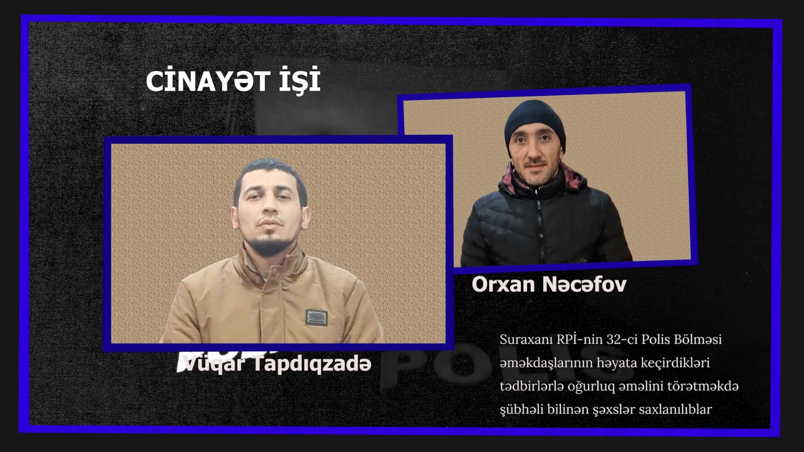 Suraxanı RPİ-nin 32-ci Polis Bölməsi əməkdaşlarının həyata keçirdikləri tədbirlərlə oğurluq əməlini törətməkdə şübhəli bilinənlər - axtarışda olan 35 yaşlı Vüqar Tapdıqzadə və 33 yaşlı Orxan Nəcəfov müəyyən olunaraq saxlanılıblar.