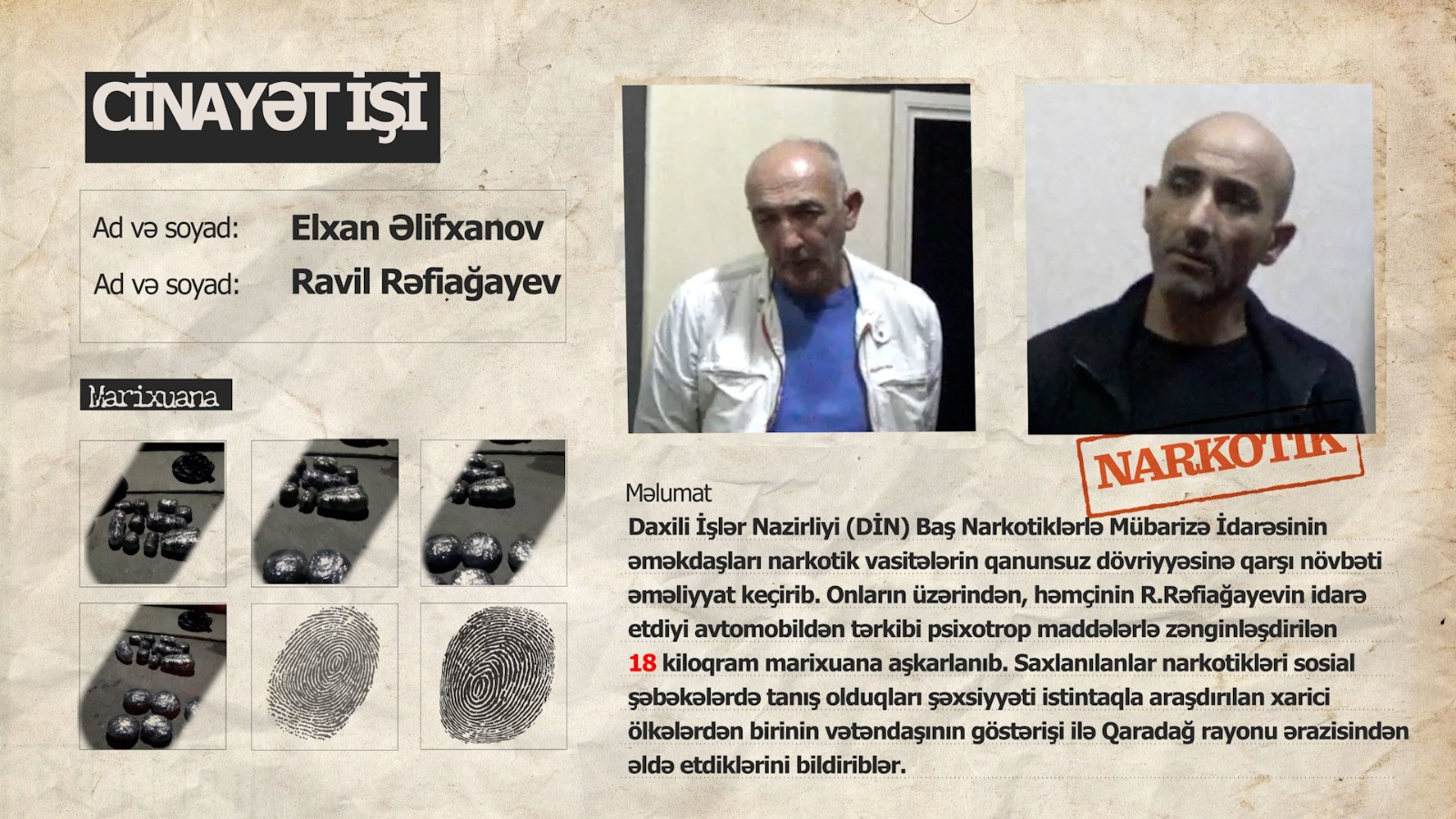 Nazirlikdən Lent.az-a verilən xəbərə görə, tədbir zamanı əvvəllər məhkum olunmuş Elxan Əlifxanov və tanışı Ravil Rəfiağayev saxlanılıblar. Onların üzərindən, həmçinin R.Rəfiağayevin idarə etdiyi avtomobildən tərkibi psixotrop maddələrlə zənginləşdirilən 18 kiloqram marixuana və narkotiklərin dövriyyəsində istifadə olunan bank kartı aşkarlanıb.