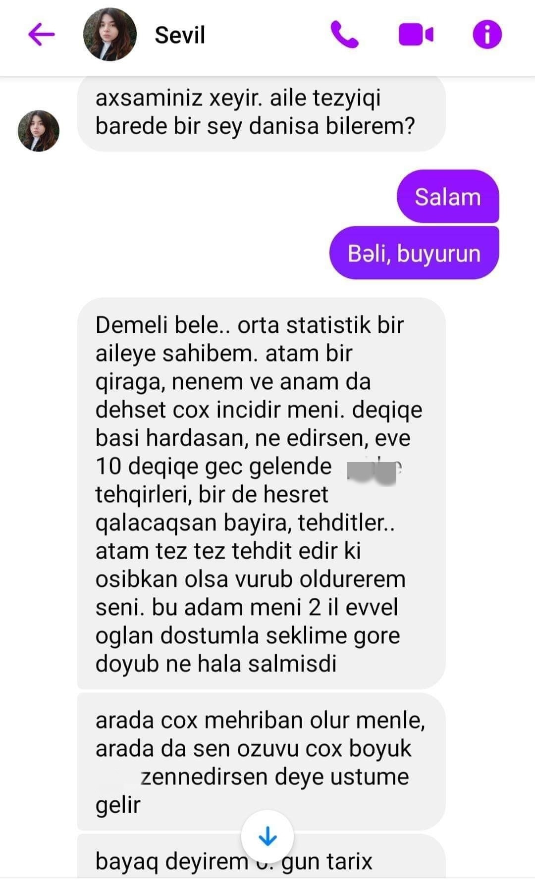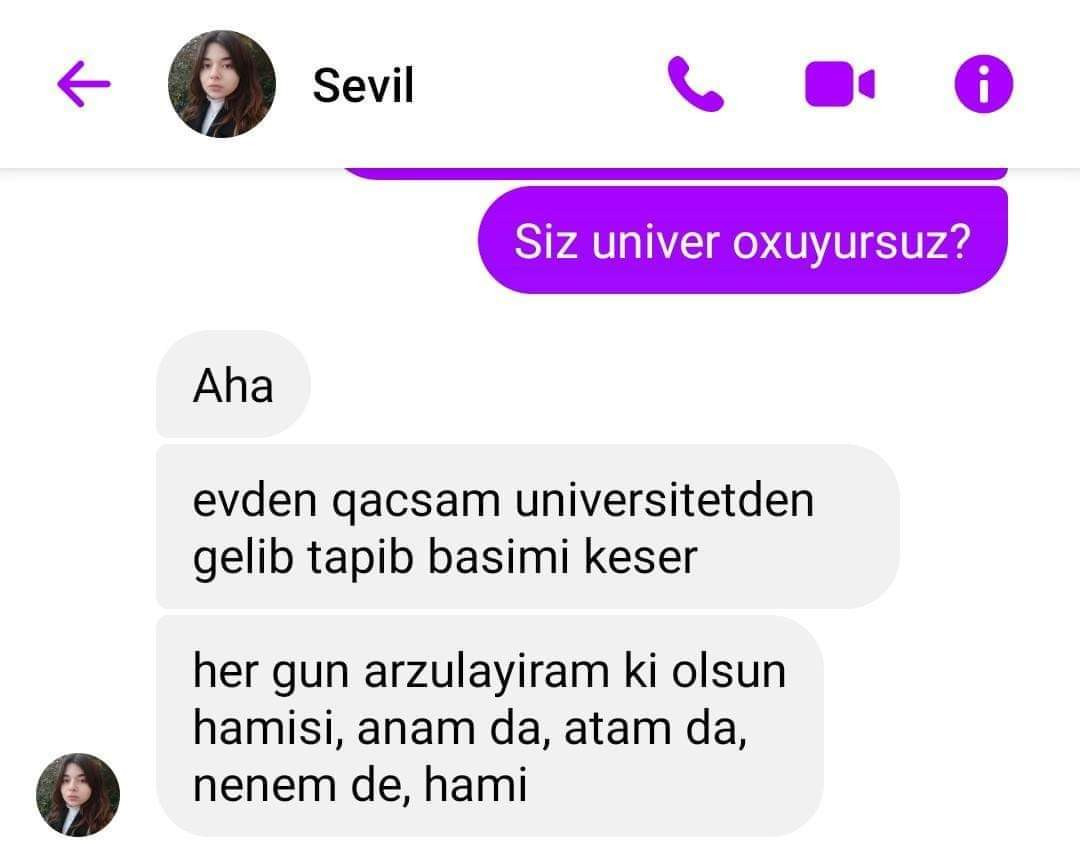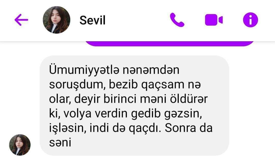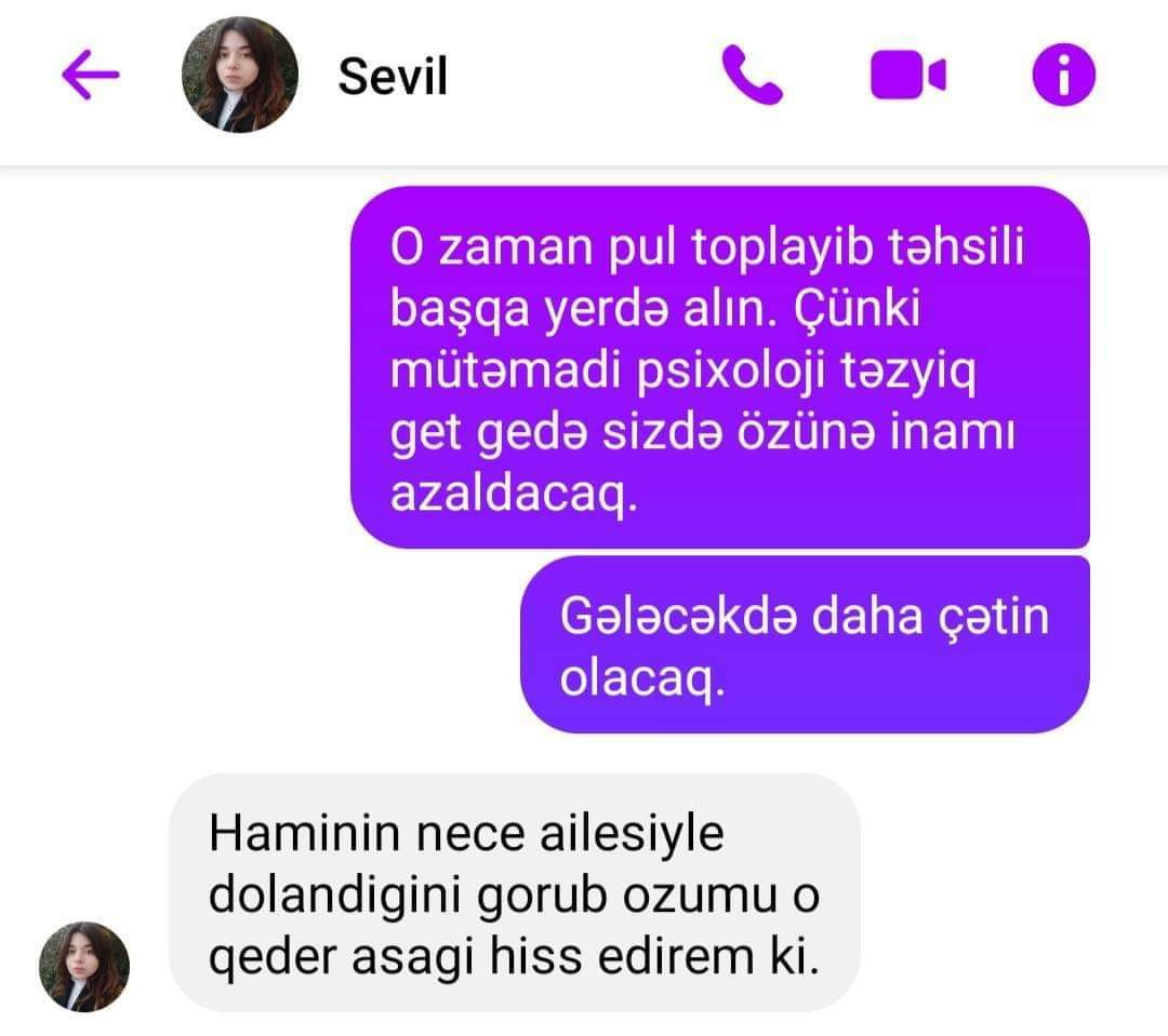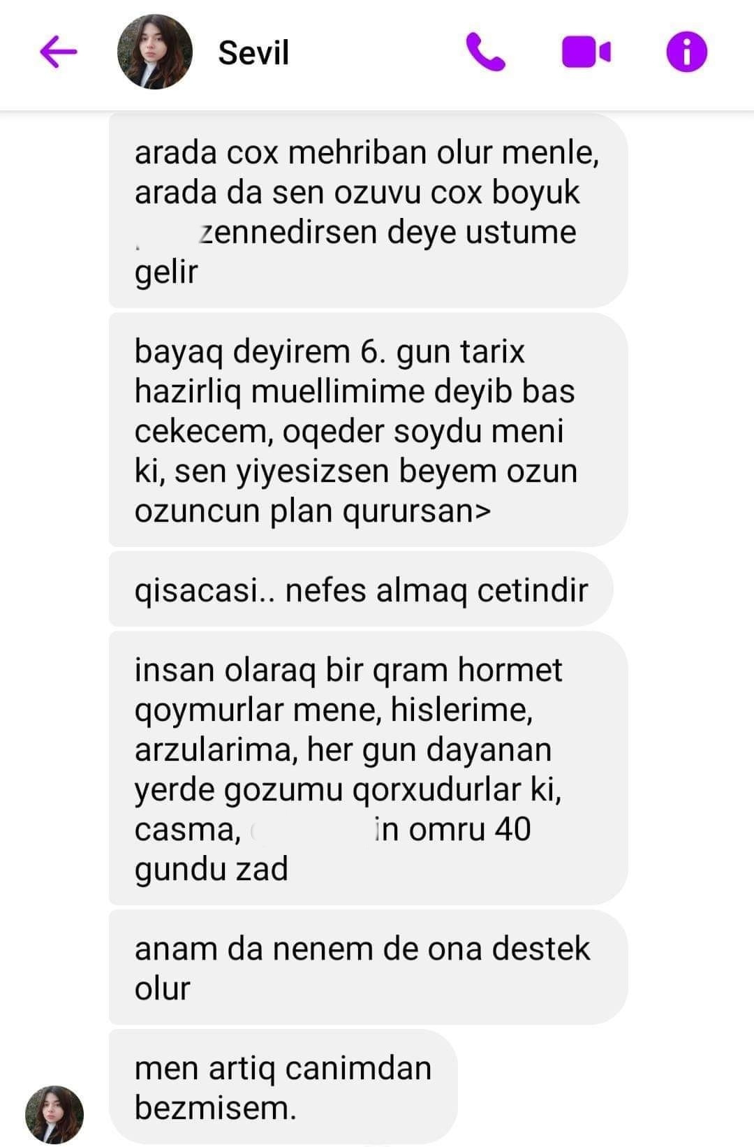 Lent.az-ın əldə etdiyi məlumata görə, özünü Xətai rayonu "Sevgililər parkı" yaxınlığındakı binanın 20-ci mərtəbəsindən atan gənc qızın başına gələnlərlə bağlı psixoloqa yazdığı mesajlar üzə çıxıb. Qeyd olunan mesajlarda Azərbaycan Turizm və Menecmentlik Universitetinin tələbəsi olan mərhum qız ailədə çətinliklərlə üzləşdiyini, daim təhdid altında qaldığını bildirib. Ətraflı məlumatı təqdim edəcəyimiz fotolarda oxuya bilərsiniz: