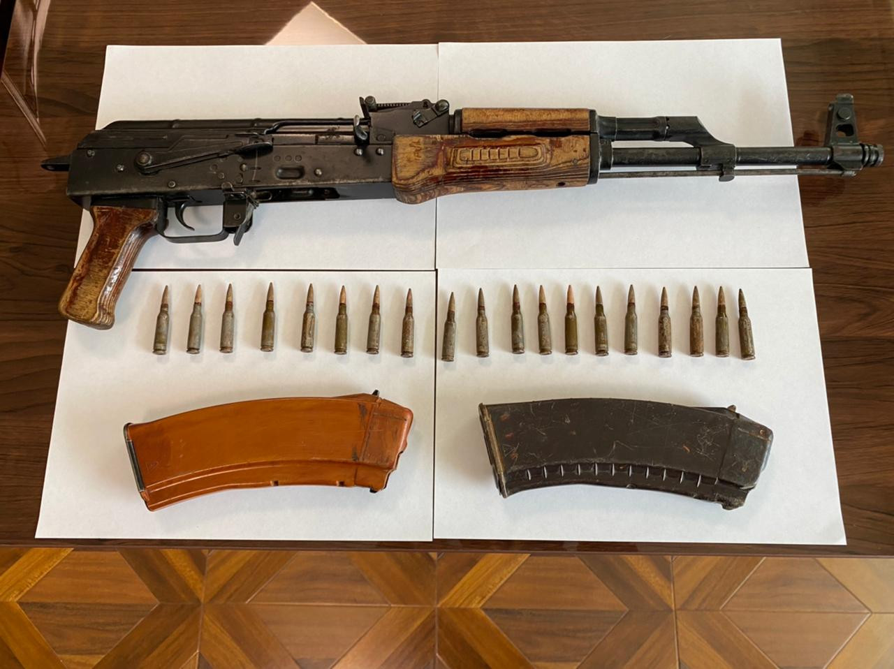 Əməliyyat tədbirlərinin davamı olaraq M.Əlyarovun yaşadığı evə keçirilmiş axtarış zamanı isə oradan bir ədəd "AKS" markalı avtomat, 19 ədəd patron və iki ədəd sandıqca aşkar edilərək götürülüb.
