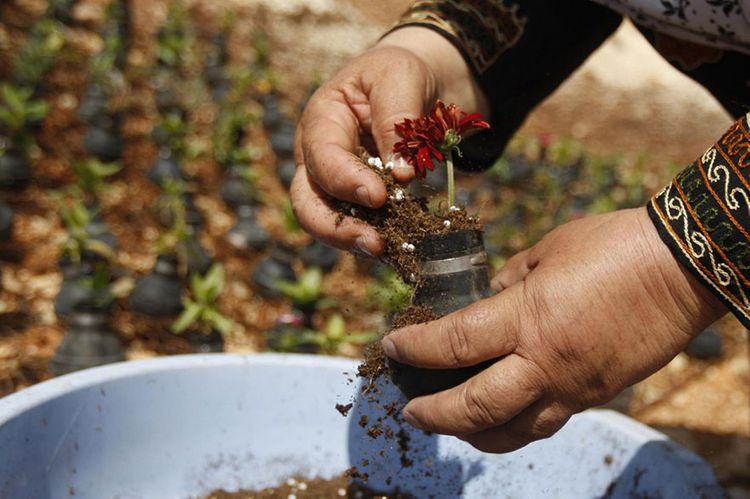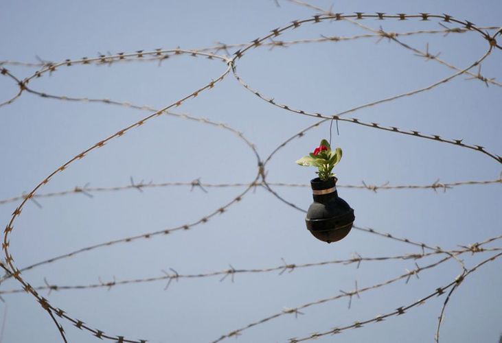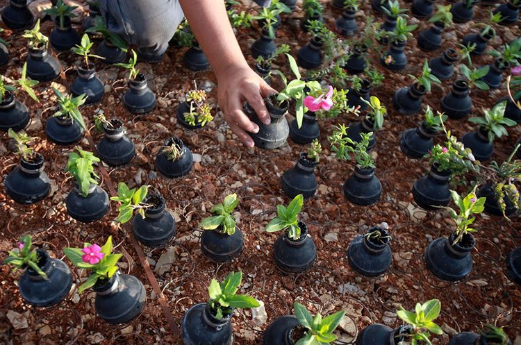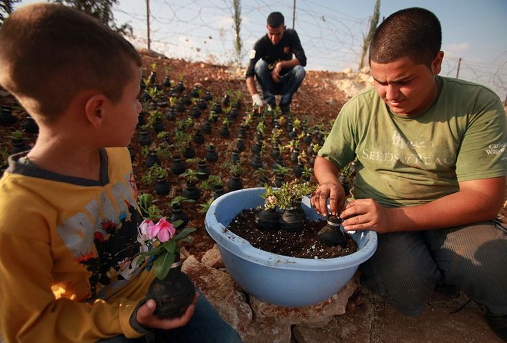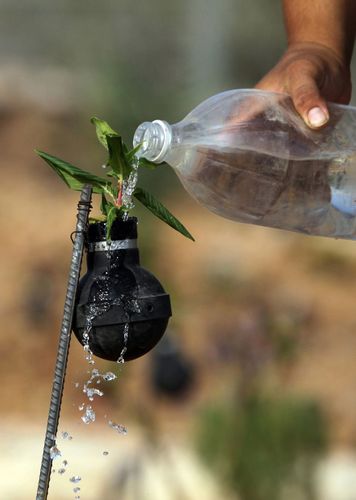 Fələstinin müvəqqəti paytaxtı Ramallah yaxınlığındakı Bilin kəndindən olan bir fələstinli qadın, İsrail əsgərləri ilə yerli fələstinlilər arasında baş verən qarşıdurmalardan sonra gözyaşardıcı qaz bombalarını toplayaraq onların boşluqlarında çiçək yetişdirir.