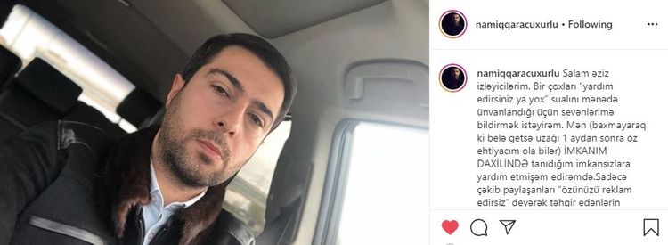 "Bir çoxları "Yardım edirsiniz, ya yox" sualını mənə də ünvanlayır. Sevənlərimə bildirmək istəyirəm ki, imkanım daxilində tanıdığım insanlara yardım etmişəm, edirəm də. Çəkib paylaşanları "Özünüzü reklam edirsiz" deyərək, təhqir edənlərə görə çəkmirəm və paylaşmıram".