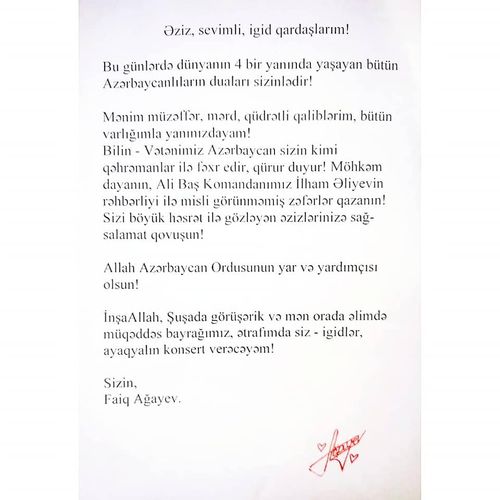 Xalq artisti Faiq Ağayev əsgərlərə məktub göndərib.