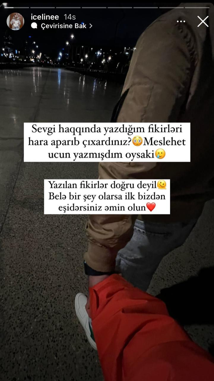 “Sevgi haqqında yazdığım fikirləri hara aparıb çıxarırsınız? Məsləhət üçün yazmışdım. Yazılan fikirlər doğru deyil. Belə bir şey olarsa, ilk bizdən eşidərsiniz, əmin olun. Maraqlıdır, siz inciyəndə heçmi “follow”dan silmirsiniz? Heçmi şəkilləri arxivləmirsiniz? Göz önündə olduğumuz üçün bu qədər üstümüzə gəlməsəniz, biz də küsüb-barışa bilsəkmi, görəsən?”.