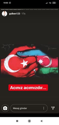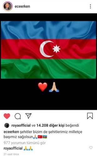 Türkiyənin məşhur aparıcısı Ece Erken şəxsi “Instagram” səhifəsində Azərbaycan bayrağı paylaşaraq “Şəhidlər bizimdə şəhidlərimizdir. Millətcə başımız sağ olsun” sözlərini yazıb.