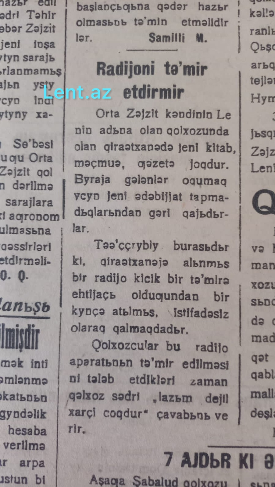 Fotoda əks olunan məqalədə indiki dövr üçün çox adi görünən məsələdən danışılır. Məlum olub ki, Zəyzid kənd kitabxanasında qəzet yoxdur, radionu isə təmir etmirlər.