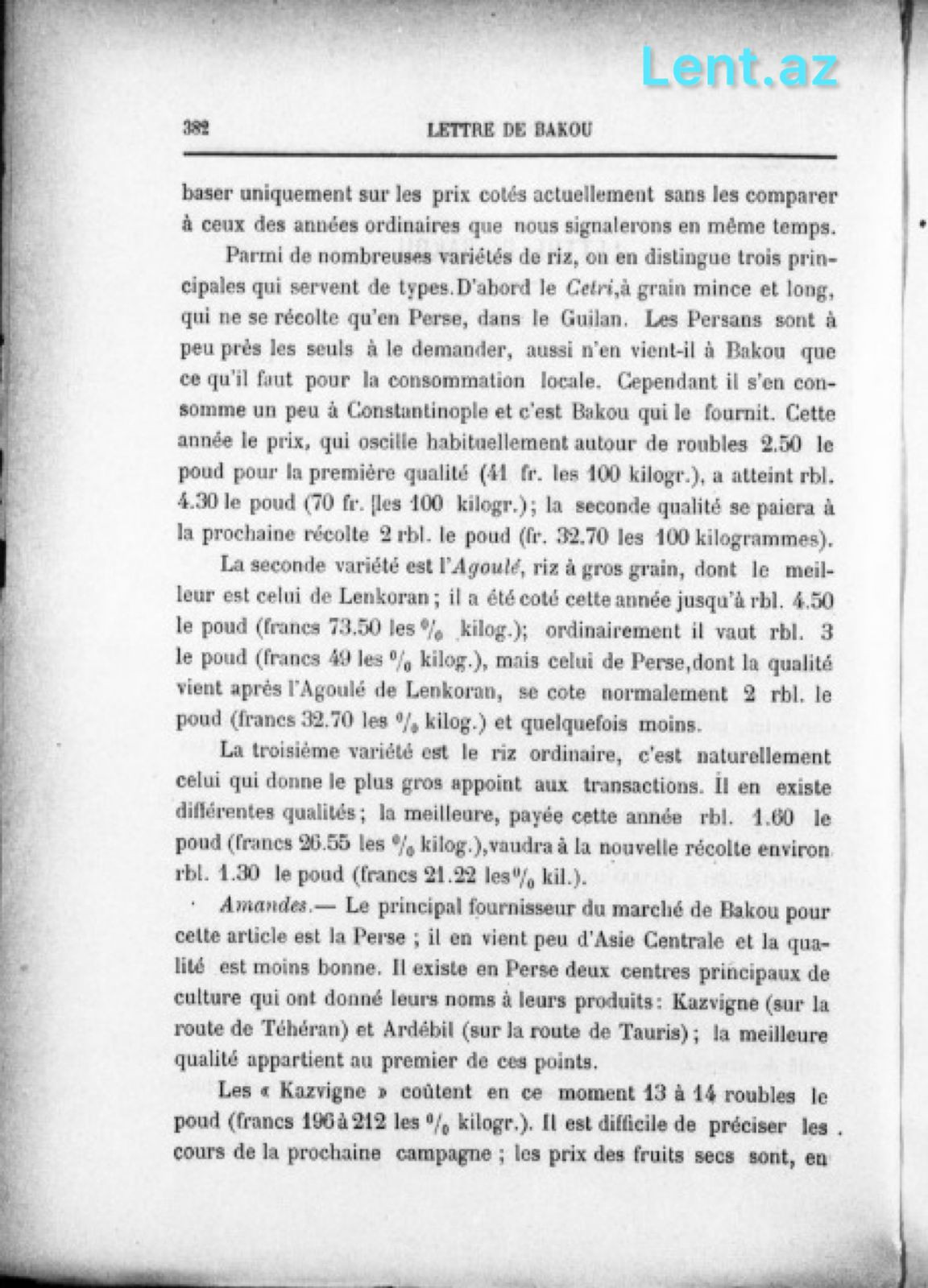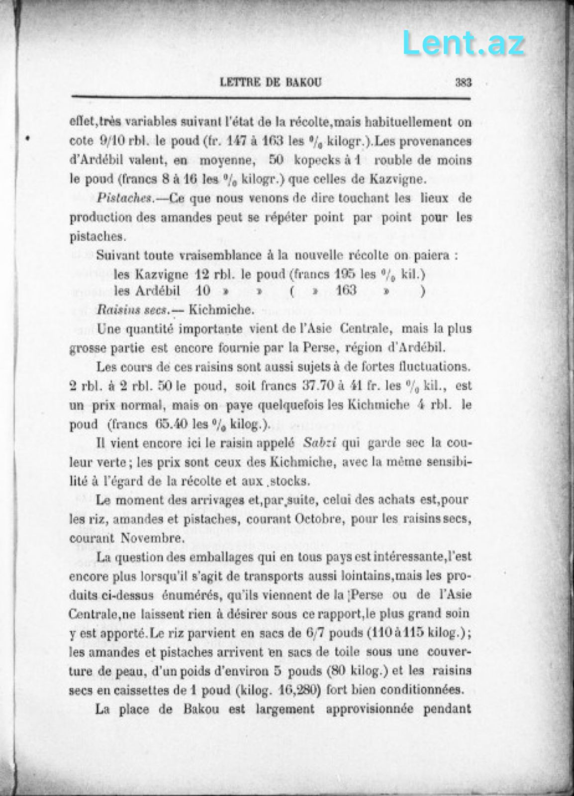 Fransızdilli “Yaxın Şərq Kommersiya Jurnalı”nın (Revue commerciale du Levant) 30 sentyabr 1900-cü il sayında Bakıda düyü və quru meyvə ticarətindən söz açılır.
