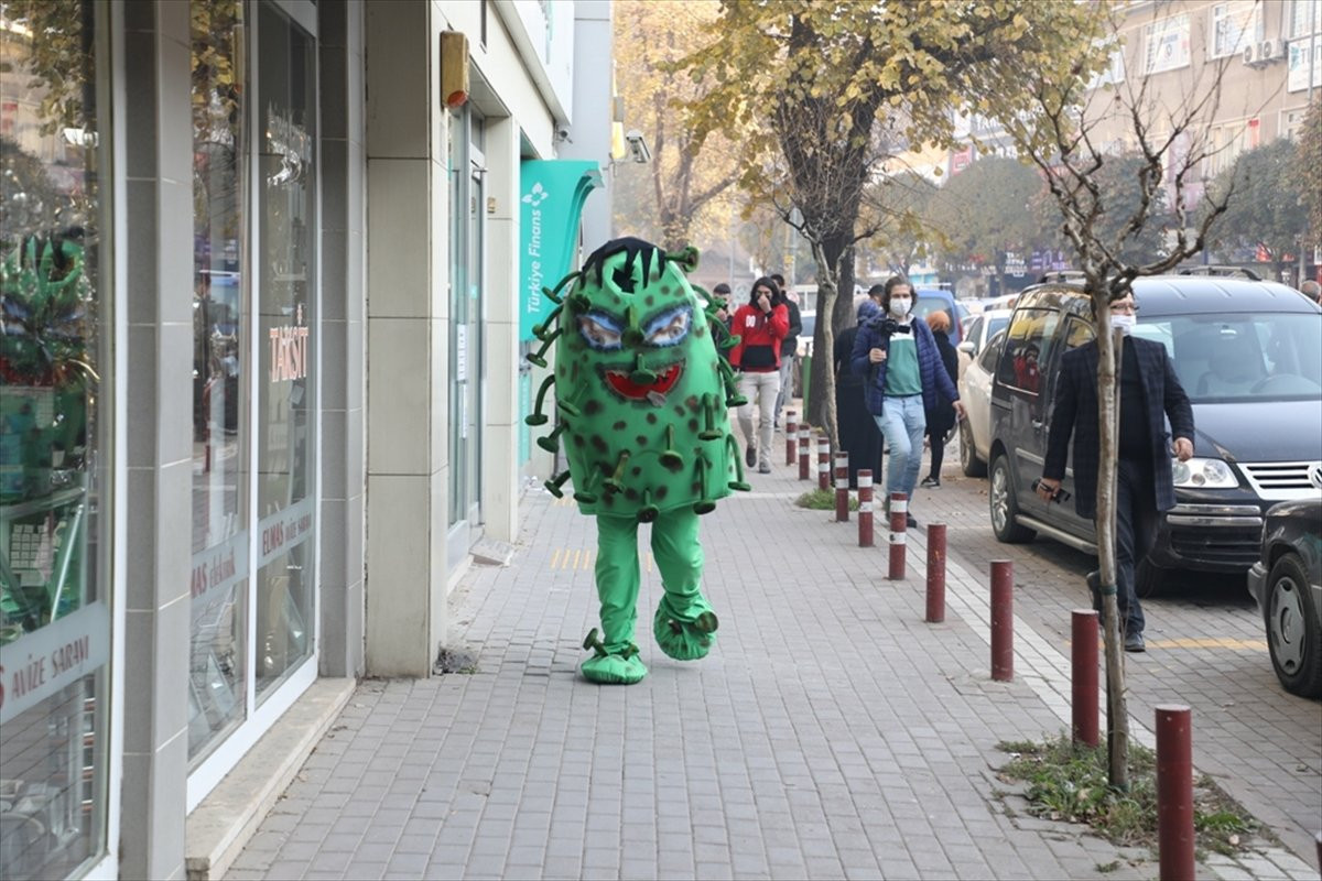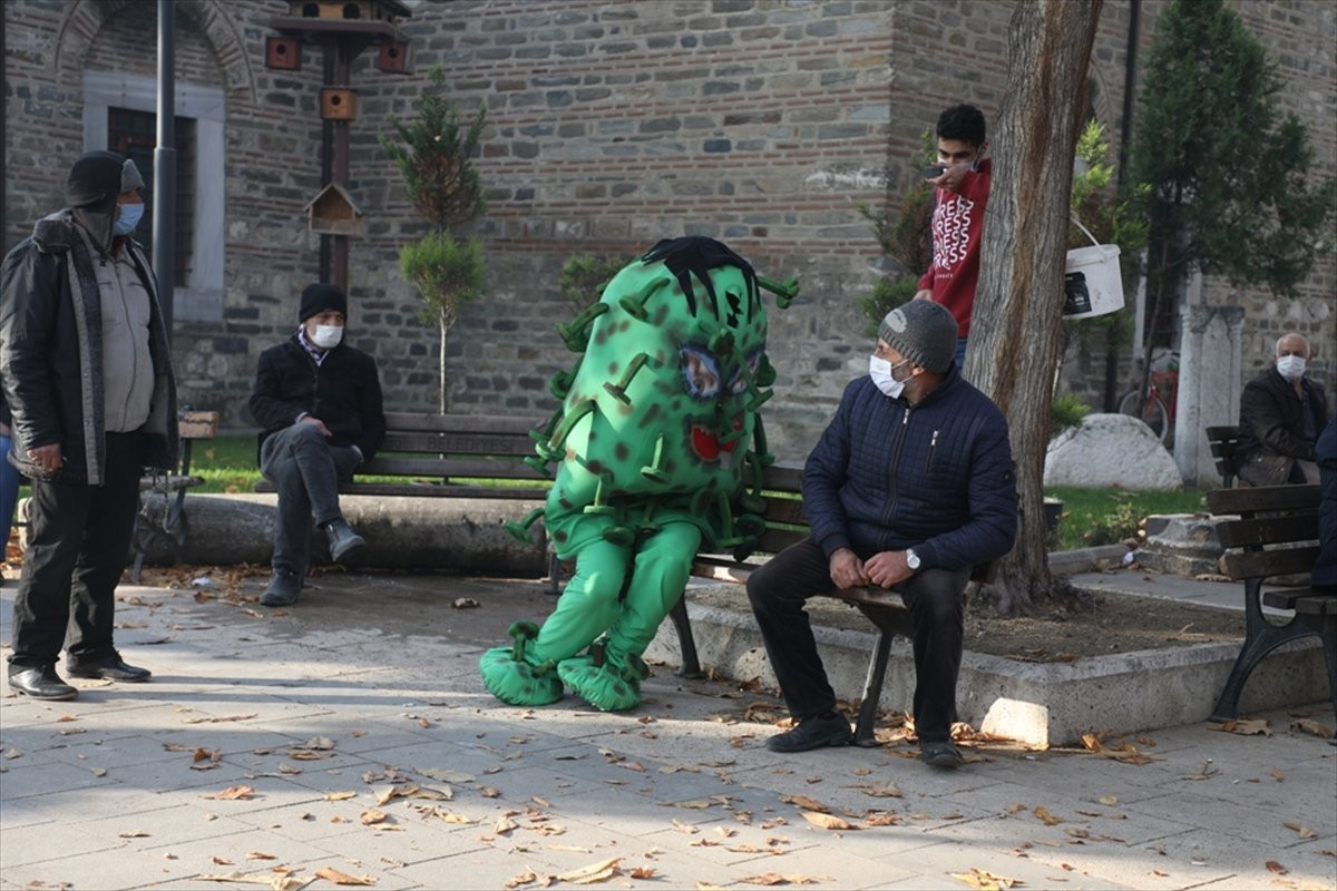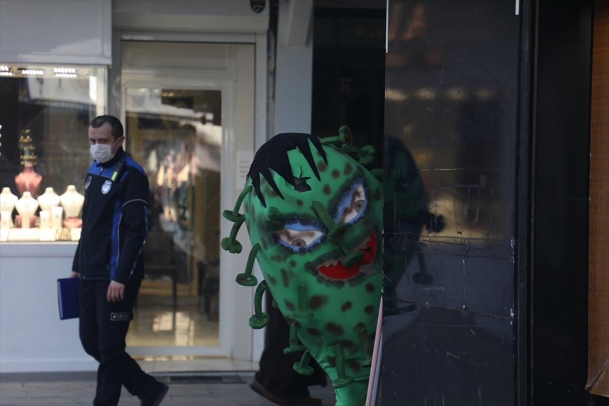İnegöl mahalında yaşıl kürə şəklində koronavirus kostyumu geyərək küçələrdə gəzən aktyor vətəndaşlara maskanı, məsafəni və təmizlik qaydalarını xatırlatıb.