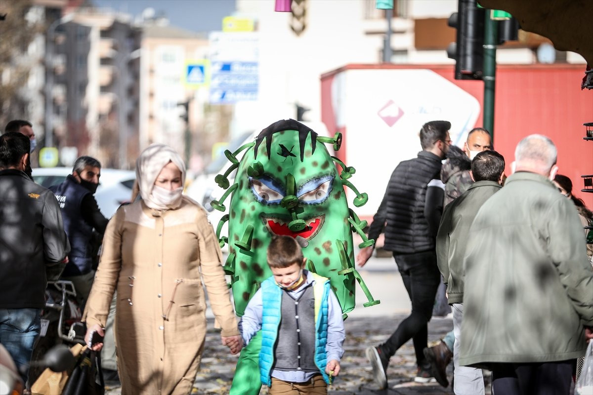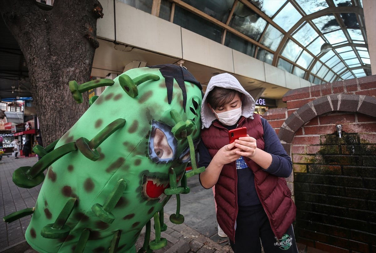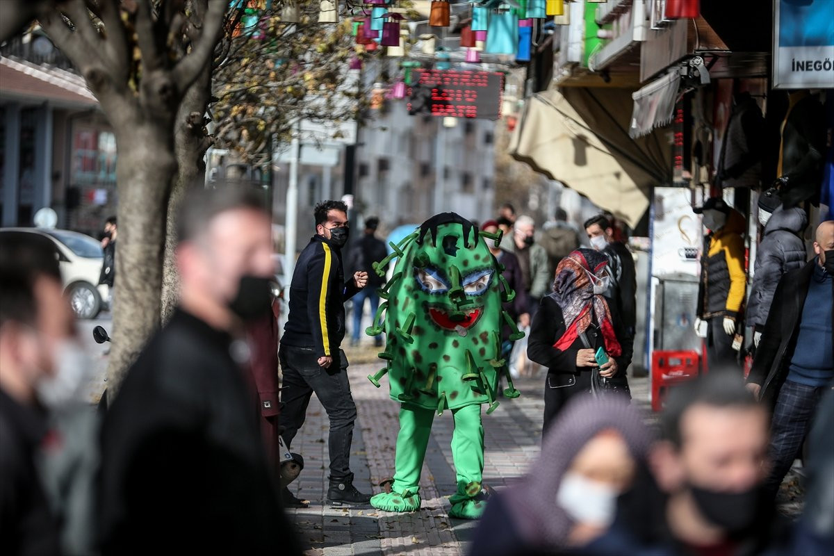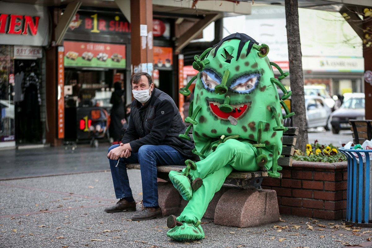 İnegöl mahalında yaşıl kürə şəklində koronavirus kostyumu geyərək küçələrdə gəzən aktyor vətəndaşlara maskanı, məsafəni və təmizlik qaydalarını xatırlatıb.