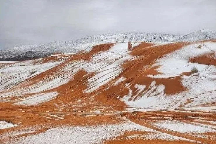 Əlcəzairin Ayn Sefra şəhərində, Saharanın şimal kənarında çəkilmiş fotolarda səhra təpələrinin qəfildən rənginin dəyişdiyi, narıncı əvəzinə ağ rəngə çevrildiyi görünür.
