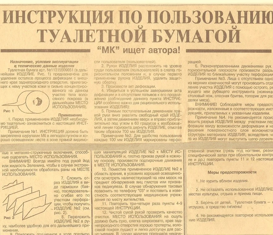 40-cı illərdə istehsal kütləviləşən zaman məlum olur ki, əhali bu malı almır. Sən demə, homos sovieticus (sovet adamı – red.) ondan sadəcə olaraq istifadə edə bilmir. Buna görə də, qəzetlərdə tualet kağızından istifadəyə dair təlimatlar dərc edildi.