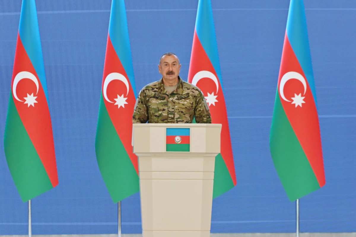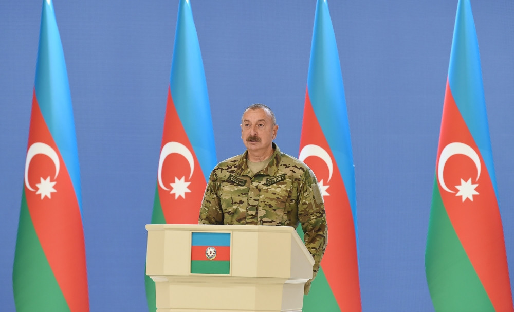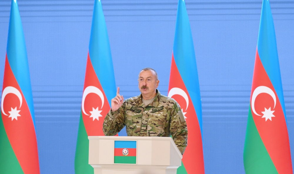 Aprel döyüşləri Ermənistana dərs olmadı. Ondan iki il sonra Naxçıvan əməliyyatı nəticəsində biz böyük ərazini götürmüşdük və gücümüzü, peşəkarlığımızı bir daha göstərmişdik. O da dərs olmadı. Nəhayət, İkinci Qarabağ müharibəsi elə dərs oldu ki, onlar bu dərsi əbədi yadda saxlayacaqlar. İkinci Qarabağ müharibəsi bizim şanlı tariximizdir. Bu tarix Azərbaycan xalqının ürəyində əbədi yaşayacaq. Bu, ədalətin təntənəsi idi. Bu, qürurun təntənəsi idi, milli ləyaqətin təntənəsi idi, Azərbaycan xalqının əyilməz ruhunun təntənəsi idi. Biz bütün gücümüzü səfərbər edib bu müharibədə Qələbə qazanaraq düşməni torpaqlarımızdan qovduq. Düşməni elə rəzil vəziyyətə qoyduq ki, onlar bizim qabağımızda diz çökdülər, ağ bayraq qaldırdılar və məcbur olub kapitulyasiya aktına imza atdılar. Halbuki, müharibə dövründə mən dəfələrlə öz çıxışlarımda və müsahibələrimdə deyirdim ki, biz dayanmağa hazırıq. Mən Prezident kimi bəyan edirəm, Ermənistan rəhbəri şəxsən bizə tarix versin, nə vaxt bizim torpaqlarımızdan erməni hərbi birləşmələri çıxır, o tarixi bizə versin və biz müharibəni dayandırırıq. Ancaq Ermənistan tərəfi yenə də bu şansı itirdi. Müharibə nəticəsində Ermənistan ordusu məhv edilib. Mən bu rəqəmləri səsləndirmişdim, siz yaxşı bilirsiniz. Siz Ermənistan ordusunu məhv etmisiniz, Ermənistan ordusu yoxdur -336 tank məhv edilib, ya da ki, qənimət kimi götürülüb. Səkkiz S300 qurğusu məhv edilib, onların hava hücumuna qarşı digər qurğuları məhv edilib, artilleriya qurğuları. Yəni, Ermənistan ordusu yoxdur. Müharibə dövründə, - artıq bu da sirr deyil, - vasitəçilər Ermənistana xəbər göndərmişdilər ki, dayanmaq lazımdır, tarix verin Azərbaycana. Ancaq onlar bundan da imtina etdilər. Biz Şuşanı işğalçılardan azad edəndən sonra məcbur olub noyabrın 9-dan 10-na keçən gecə kapitulyasiya aktına imza atdılar.