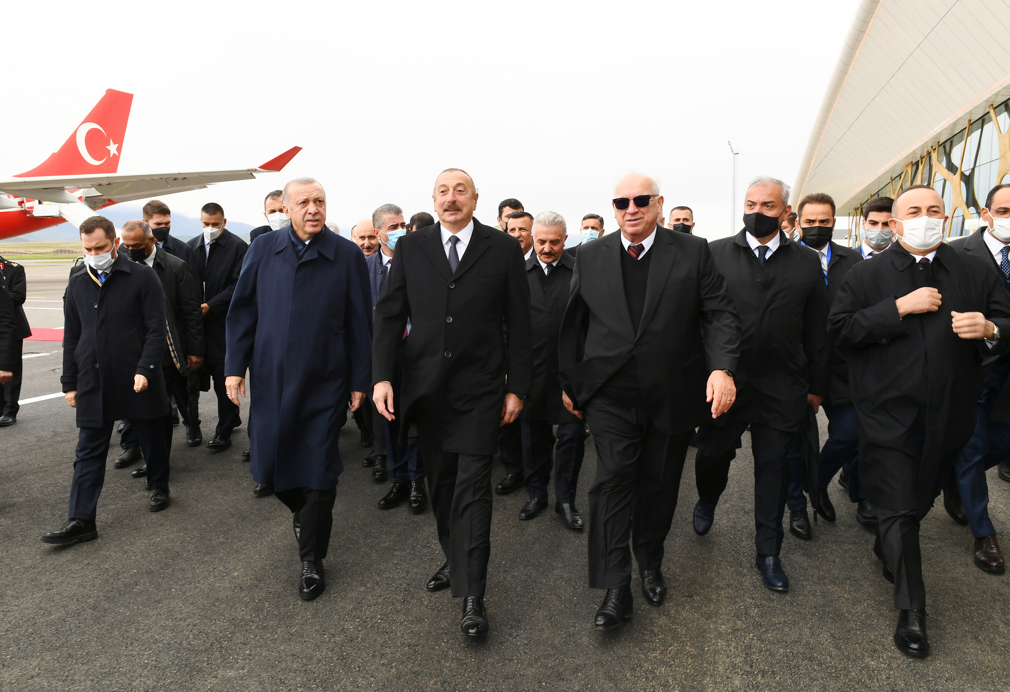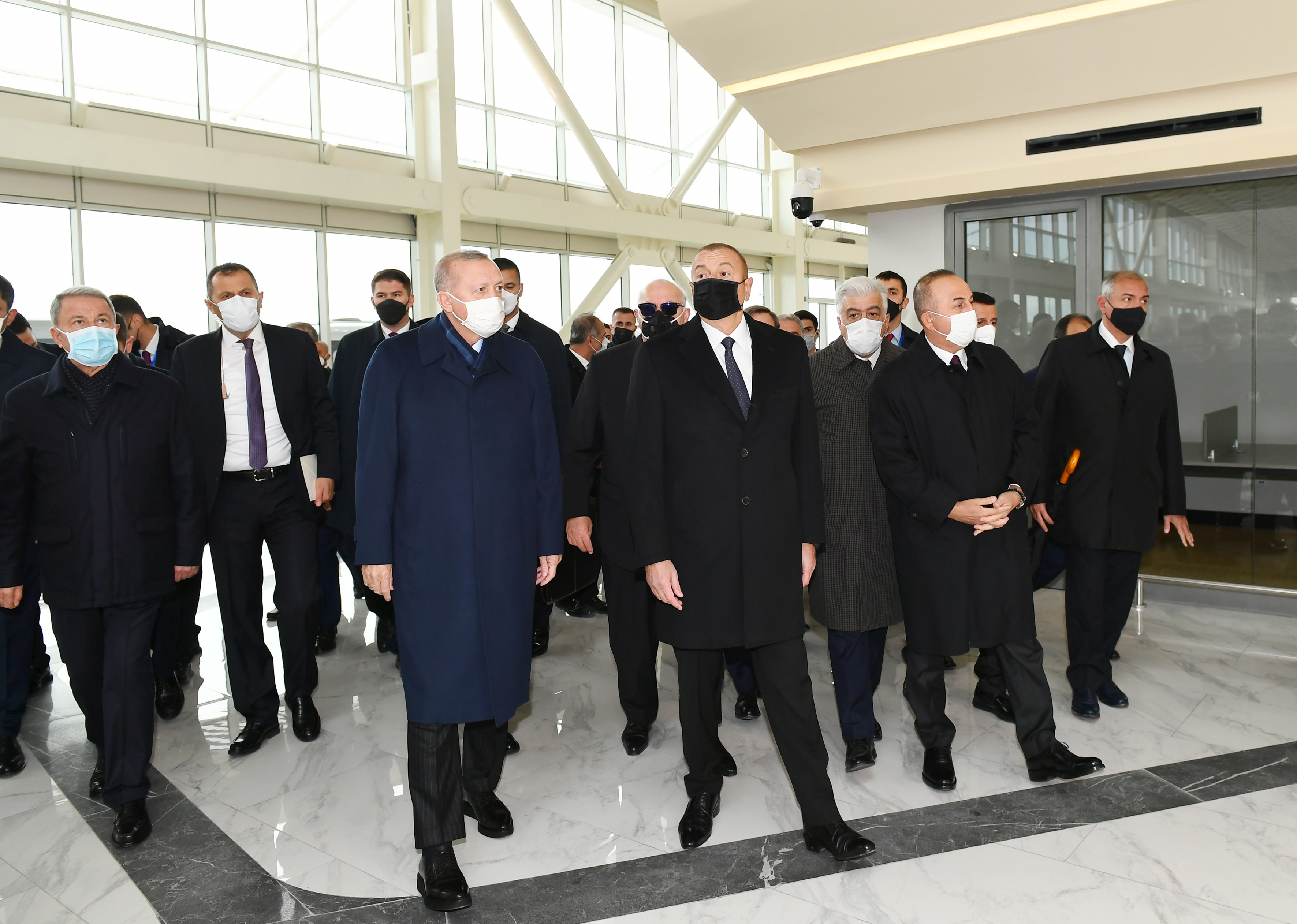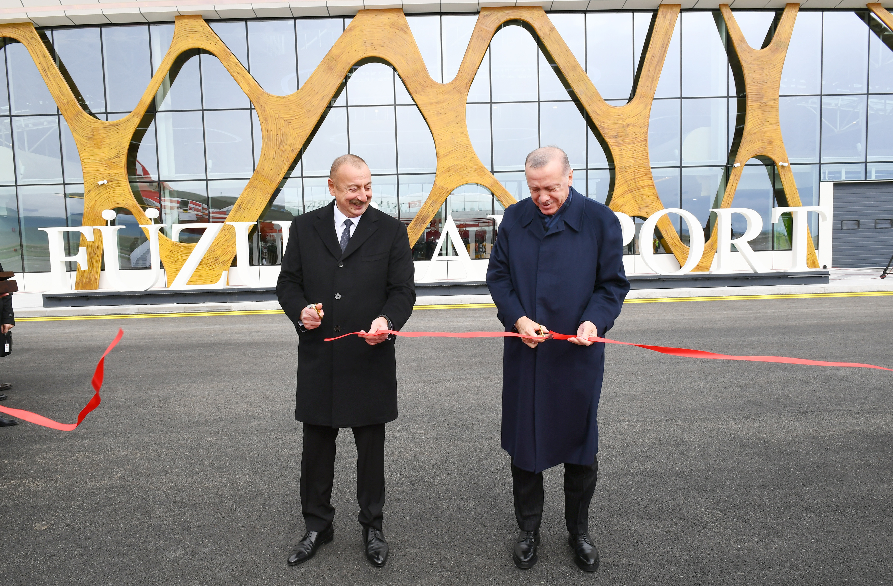 Azərbaycan və Türkiyə prezidentləri hava limanının rəmzi açılışını bildirən lenti kəsdilər.