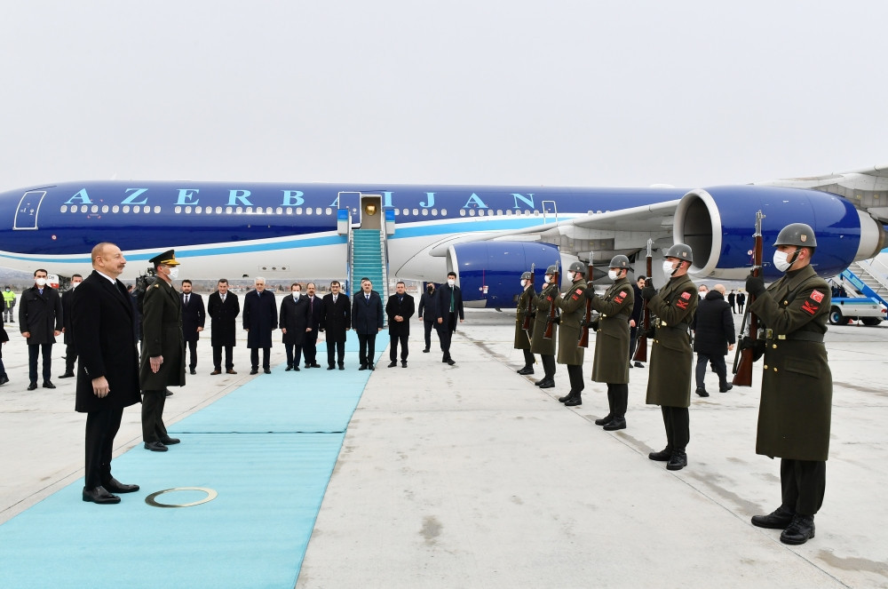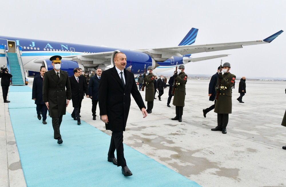 Lent.az xəbər verir ki, hər iki ölkənin Dövlət bayraqlarının dalğalandığı Ankaranın Esenboğa Hava Limanında dövlətimizin başçısının şərəfinə fəxri qarovul dəstəsi düzülmüşdü.